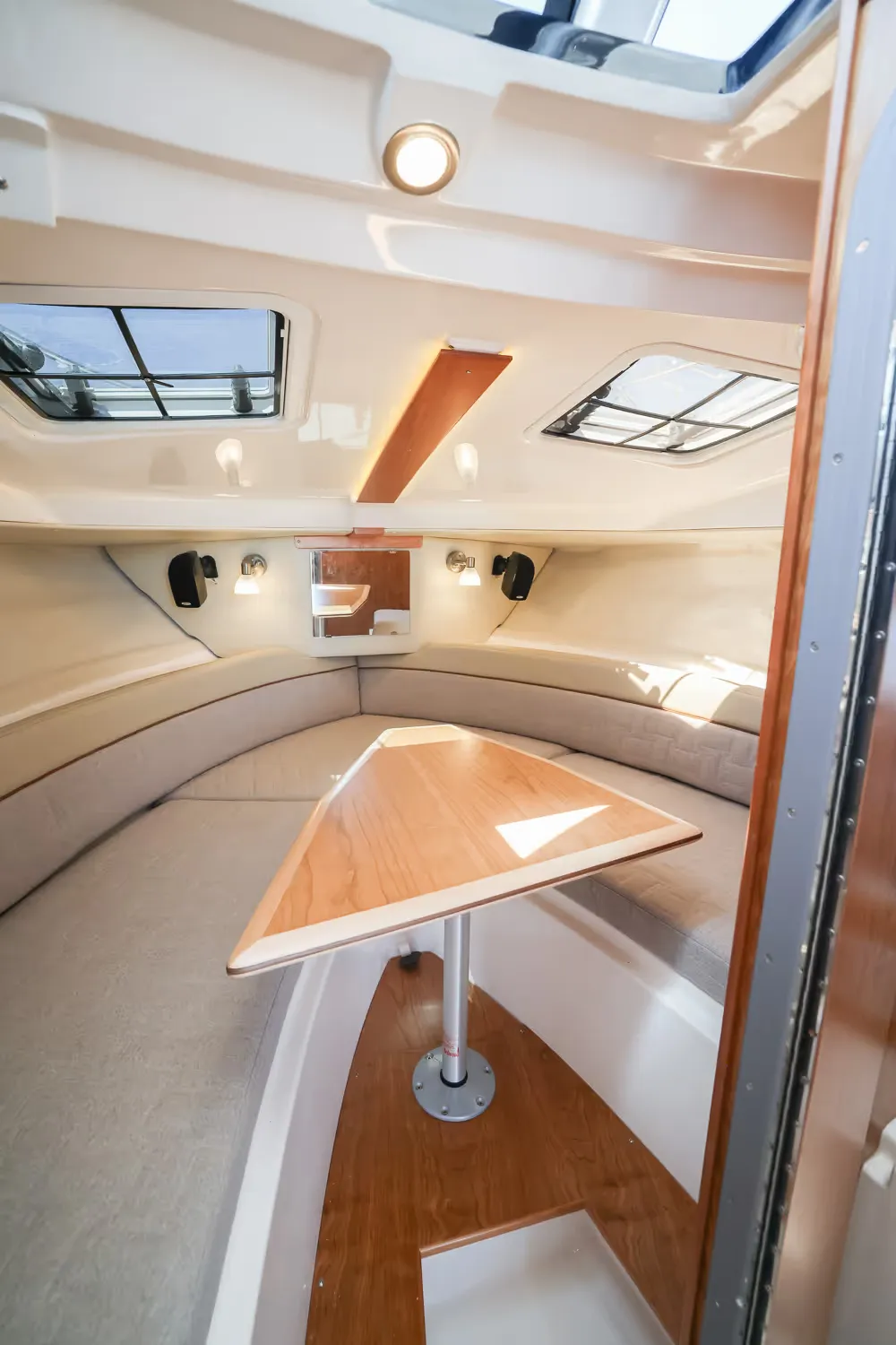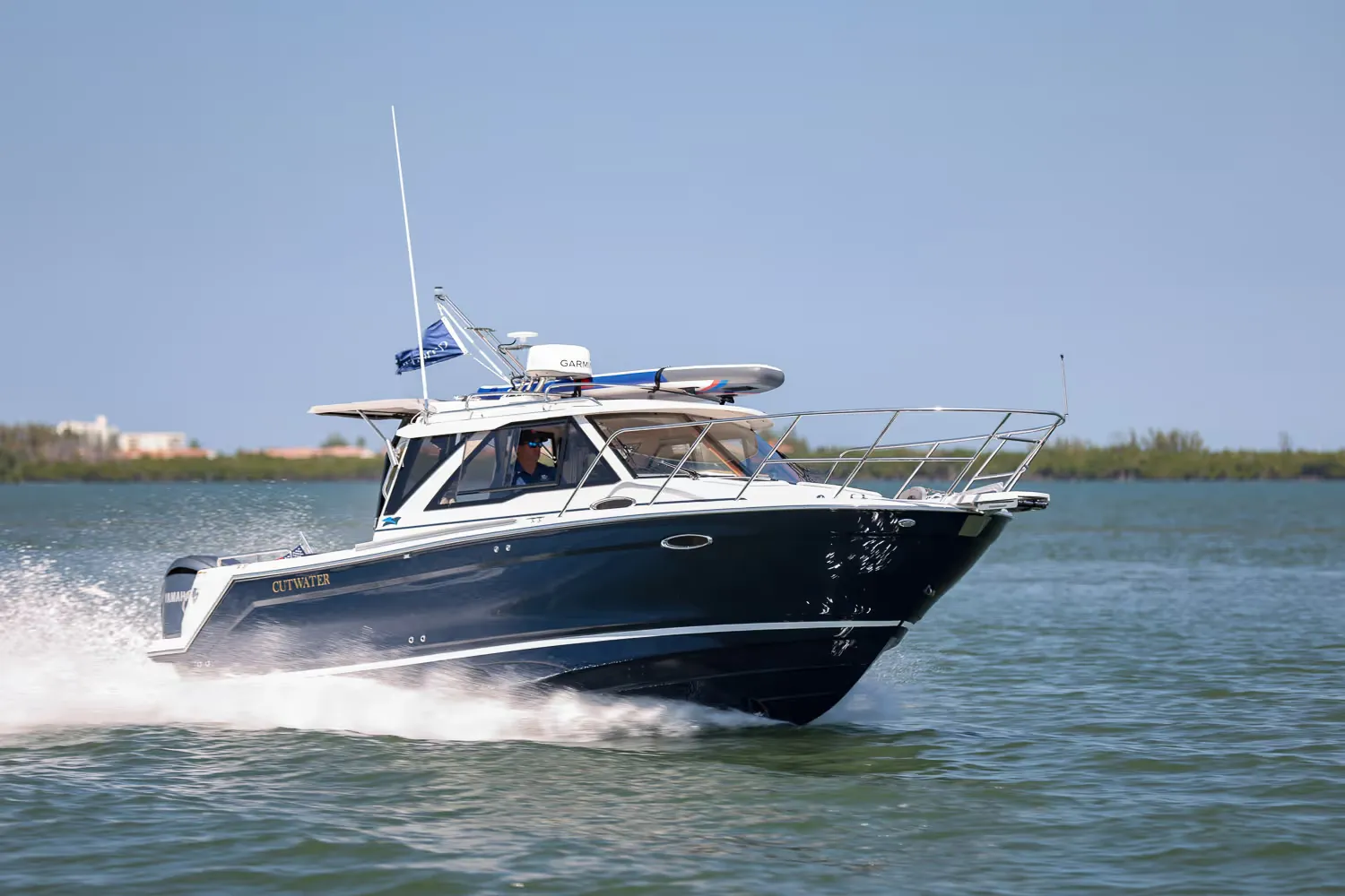 The new C-248 Coupe from Cutwater Boats presents a beautiful, contemporary twist on a classic Downeast design. This versatile outboard-powered cruiser offers an abundance of features designed to make cruising, fishing, and entertaining fun and stress-free. The C-248 C offers a 360-degree view from the helm as well as an innovative aft bulkhead window that opens, allowing the dinette seat to transform into a rear-facing cockpit seat. Onboard the C-248 C you’ll enjoy all the comforts of home with a private stateroom, head, and galley featuring a sink with hot and cold water, stove top, microwave, and refrigerator/freezer.