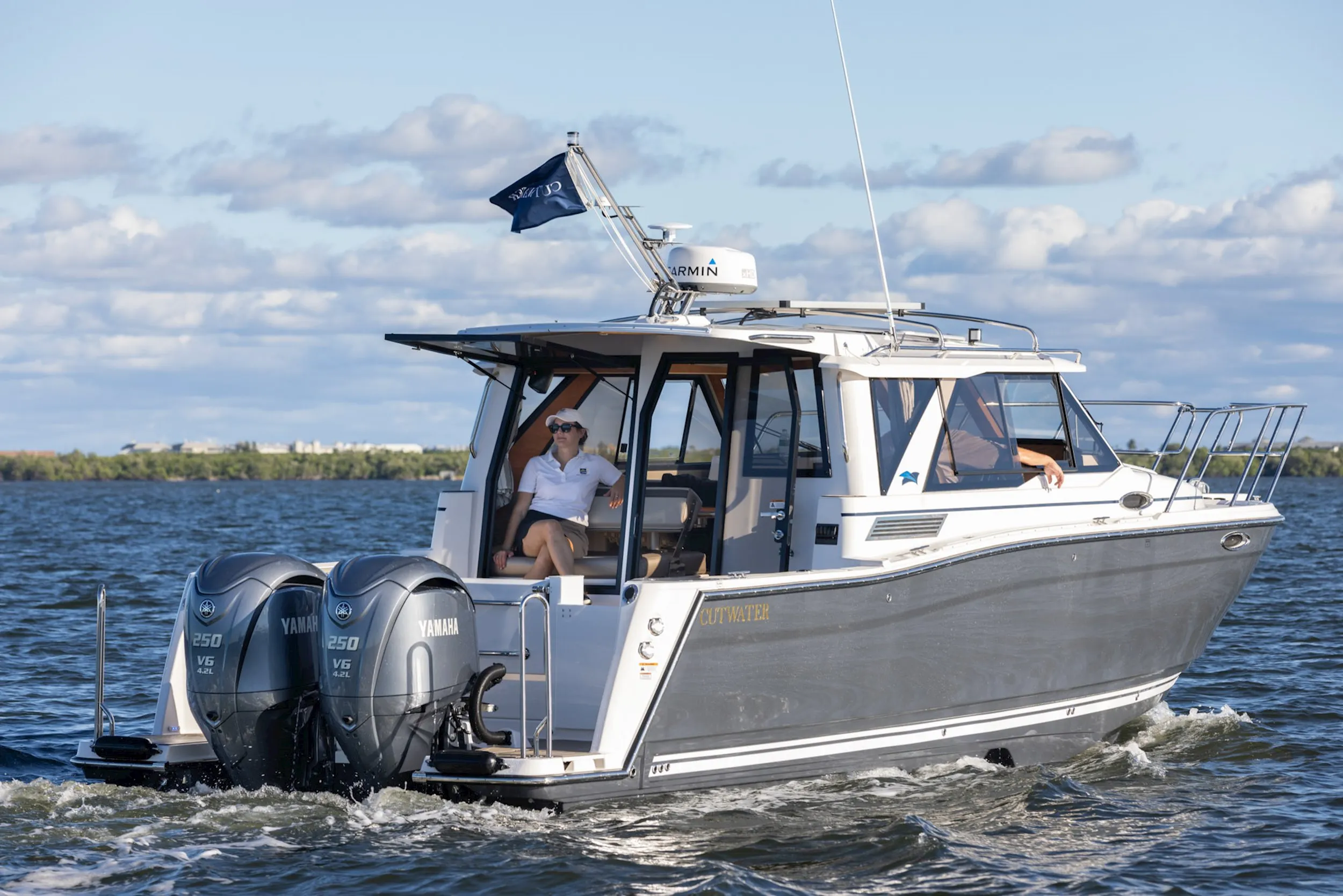 True to the Do-It-All nature of Cutwater Boats, the C-288 C is loaded with premium features as standard equipment, providing unsurpassed versatility. The contemporary Downeast design is set to turn heads wherever she’ll roam, and avid cruisers will appreciate the abundant power produced by the twin counter-rotating Yamaha F250 outboards. The C-288’s advanced hull design delivers the perfect blend of performance, comfort and efficiency thanks to the double-stepped deep-V hull, Laminar Flow Interrupters and a stout 10’ beam. The generous beam maximizes cabin area and on-water stability while remaining trailerable.
