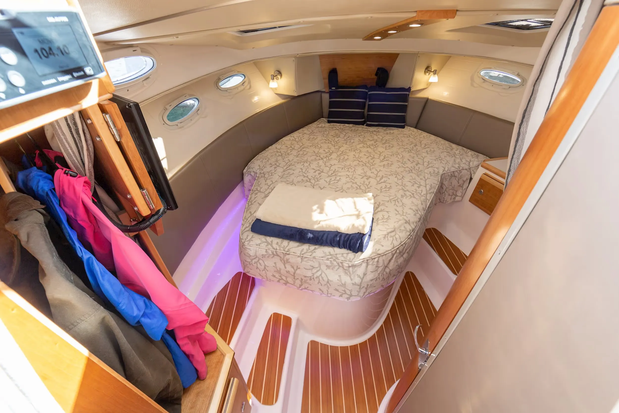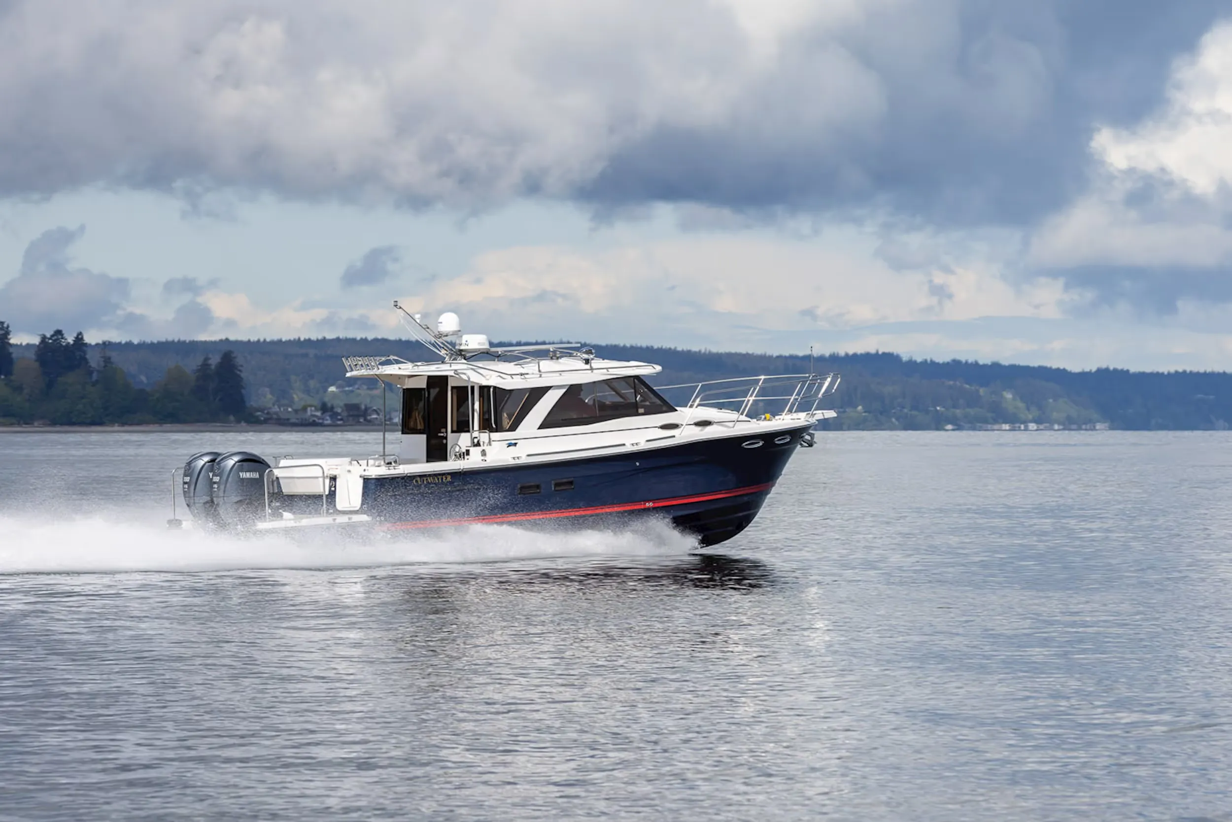 Do it all with this no-compromise cruiser. The Cutwater 32 Coupe (C-32 C) introduces an entirely new way of thinking about an outboard cruiser. Performance and comfort are central to the design. The advanced double-stepped, deep-V hull design combines speed, efficiency and superior stability. Our Laminar Flow Interrupters allow for smooth, positive cornering. Roll the throttles forward and you’ll feel the powerful twin, counter-rotating 300HP Yamaha outboards, propel the C-32 C to remarkable speeds. Upon stepping into the comfortable interior, you’ll feel fully at home. Appointed with fine wood accents throughout, a fully furnished galley, large dinette, private head and shower, and a luxurious forward stateroom featuring an island bed and recessed LED lighting, the C-32 C delivers a resort-like experience.