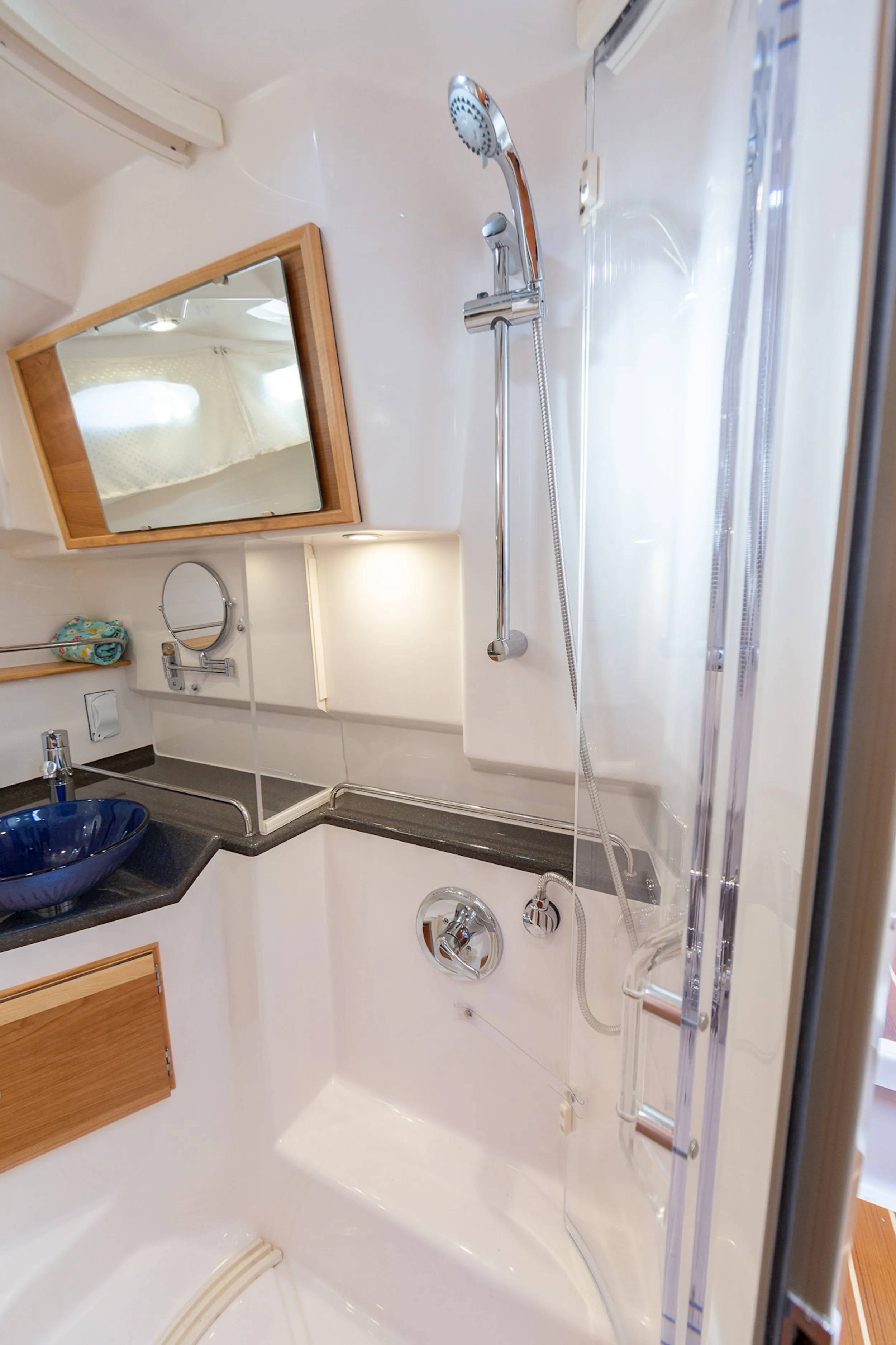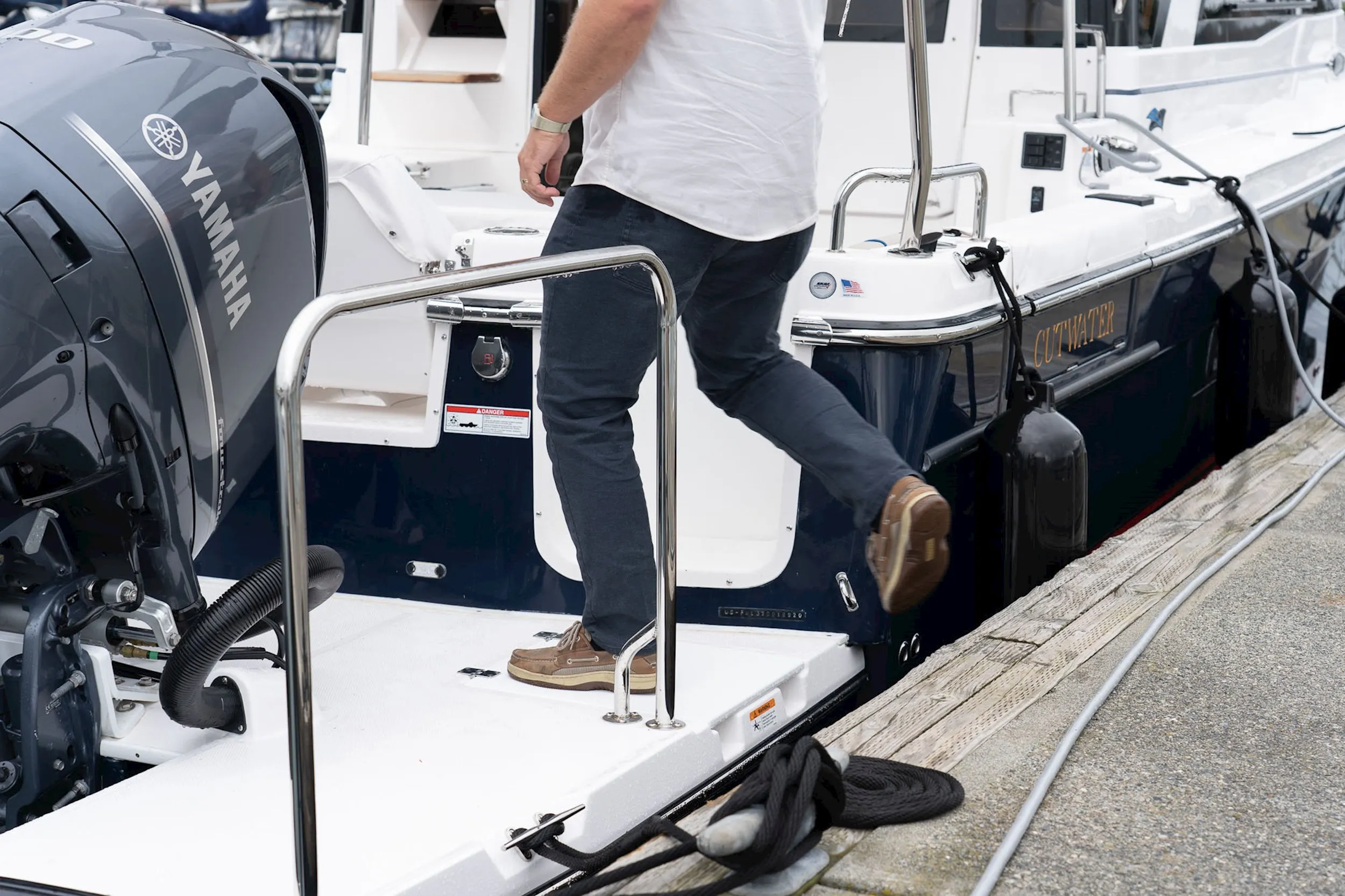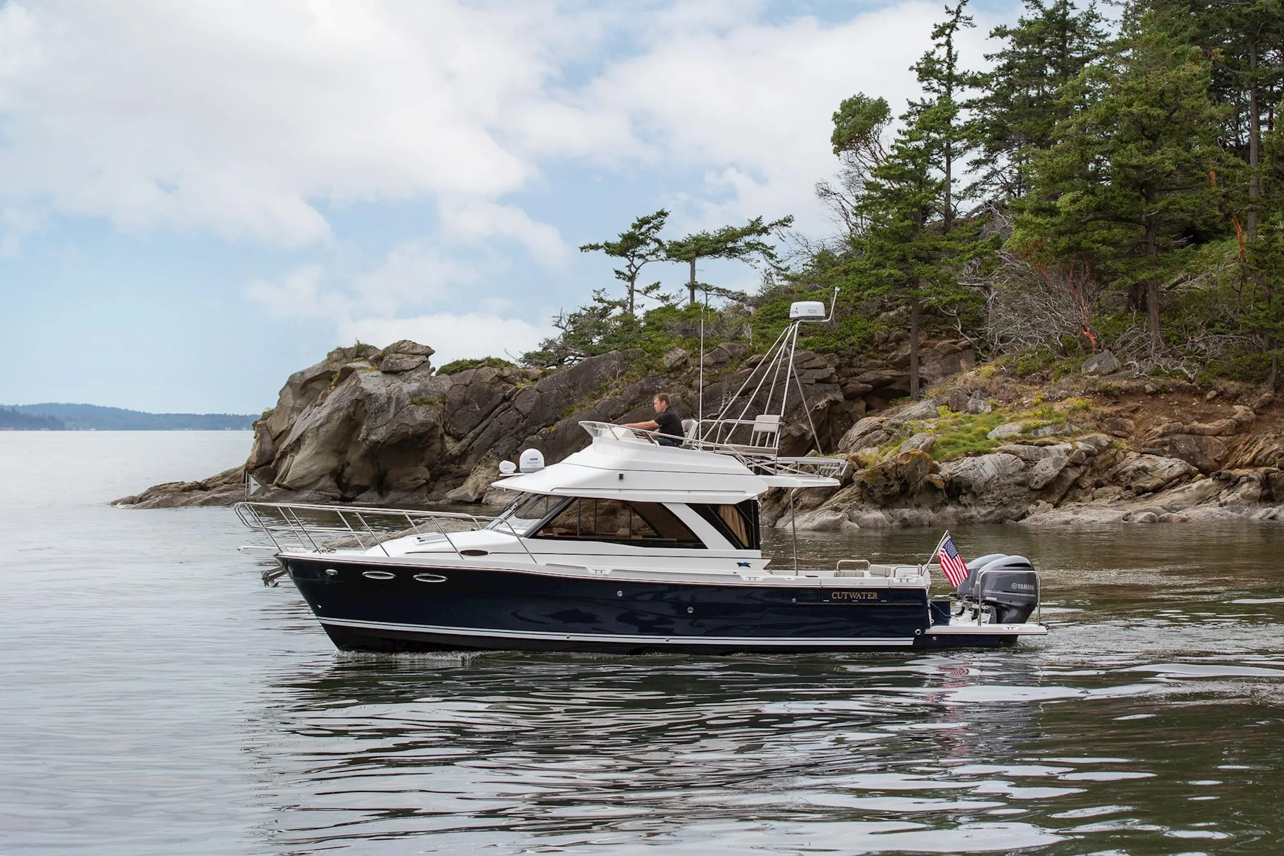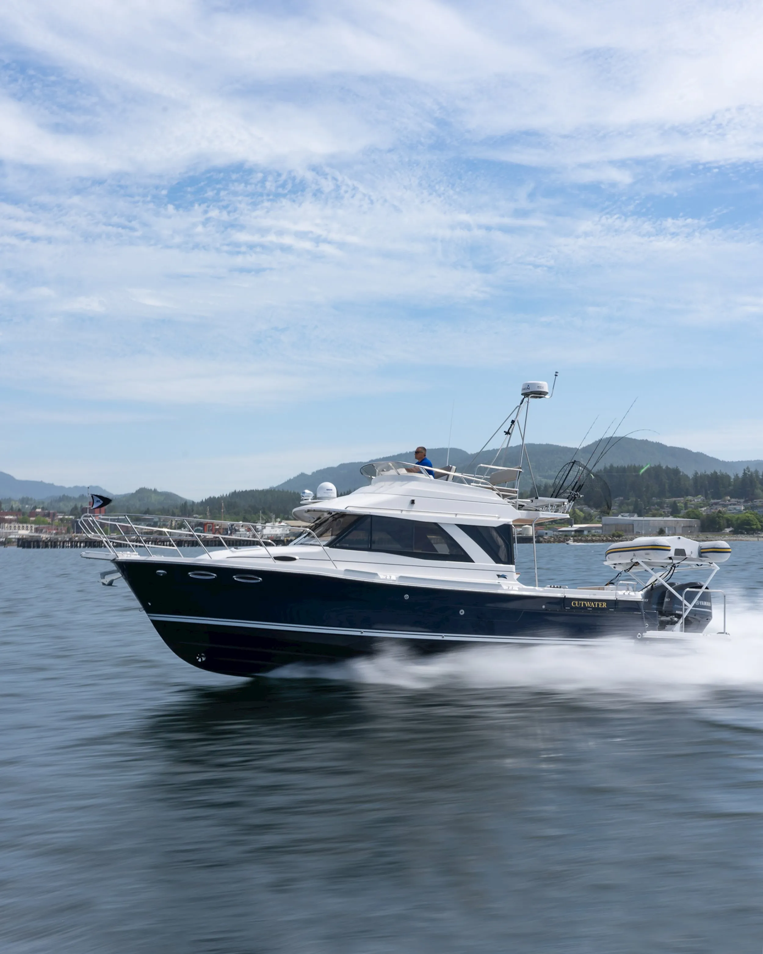 Performance, versatility, and comfort are central to the design of the Cutwater C-32 Command Bridge. The advanced double-stepped, deep-V hull combines speed, efficiency and superior stability. Our Laminar Flow Interrupters allow for smooth, positive cornering. Roll the throttles forward and you’ll feel the powerful twin, counter-rotating 300 HP Yamaha outboards propel the C-32 CB to remarkable speeds. Upon stepping into the comfortable interior, you’ll feel fully at home. With wood accents throughout, a fully furnished galley, large dinette, private head and shower, and a luxurious forward stateroom featuring an island bed with recessed LED lighting, the C-32 CB provides a resort-like experience. The large mid-ship stateroom and convertible dinette comfortably sleep up to four additional guests.