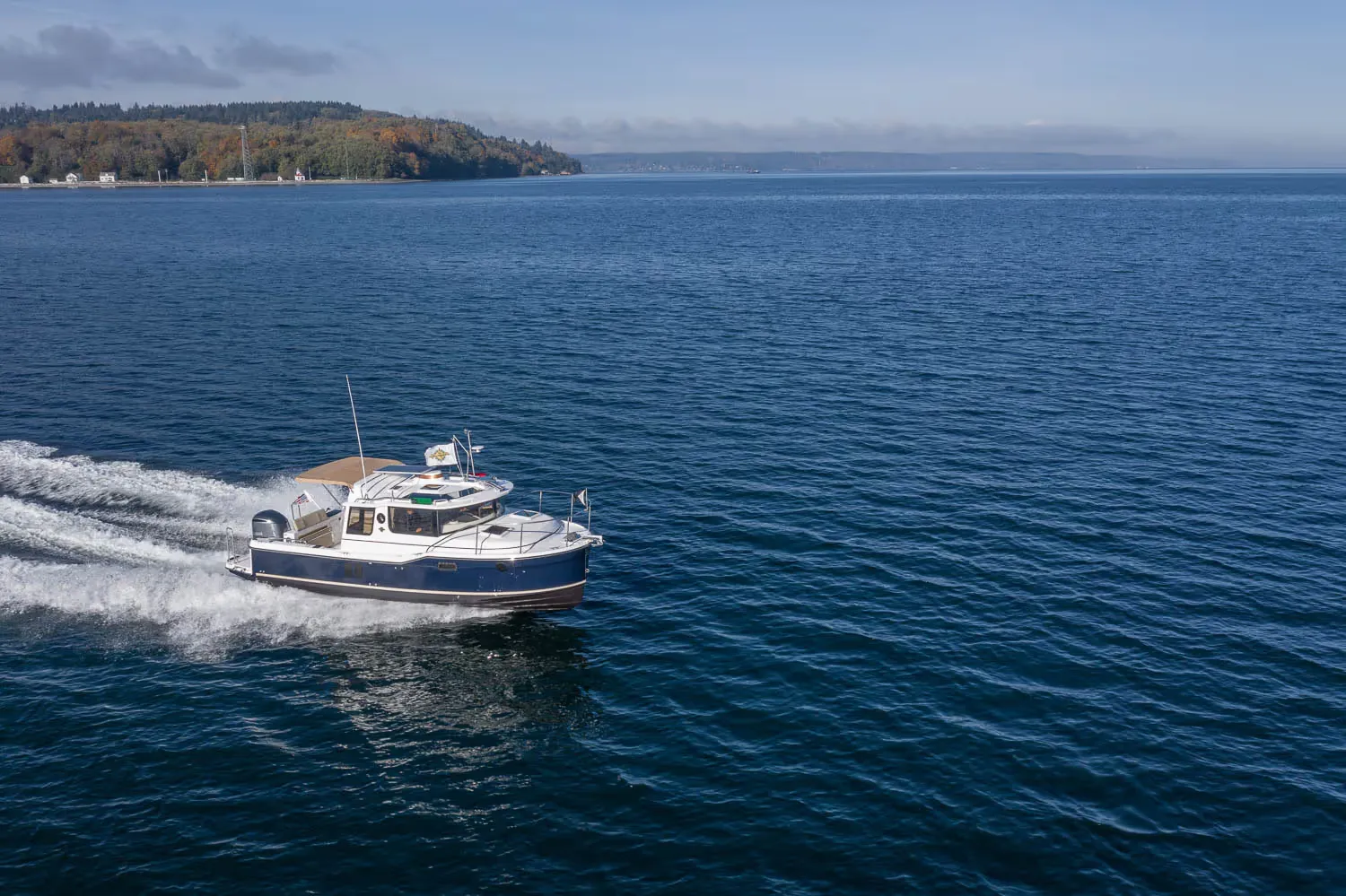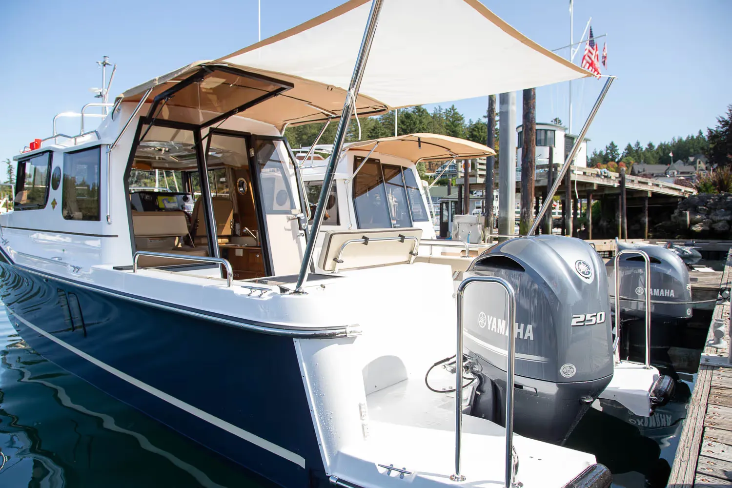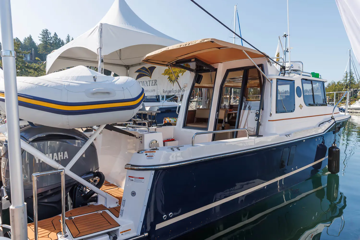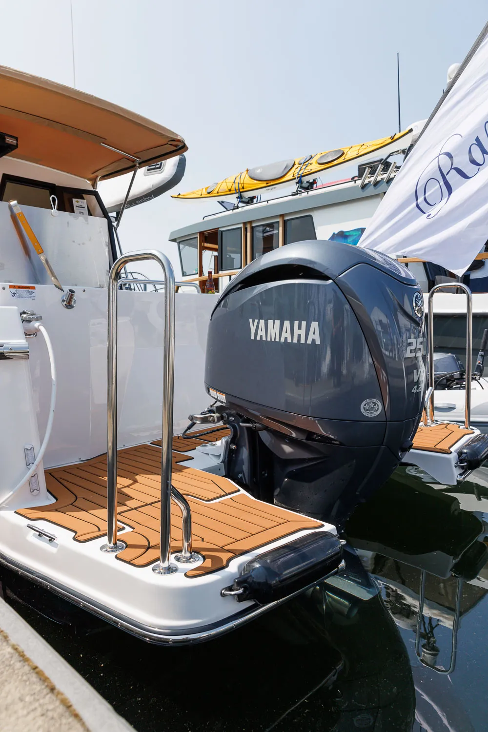 The R-25 is a feature-packed cruiser designed for comfort, ease of use, and FUN! You’ll find the Ranger Tugs DNA built into every facet of the R-25’s thoughtful design. Right away you’ll notice one of the most innovative features of the R-25, our Clear-Path swim platform. The extended swim platform wraps around the outboard to present a clear walkway free of all engine rigging, which opens a whole new world of fishing, cruising, and water-sports opportunities. This exciting new design features heavy duty handrails and allows you to safely and easily board a dinghy, net a fish, step to or from a low dock (important for pets), and med-tie without fear of damaging your outboard and having to leap to the dock.