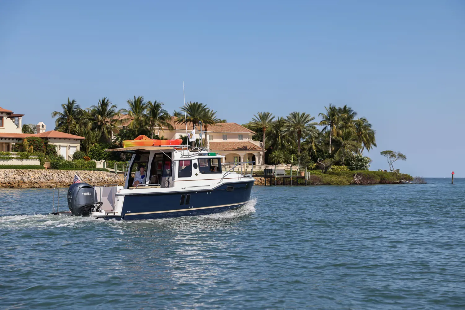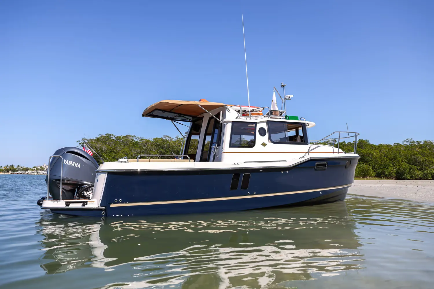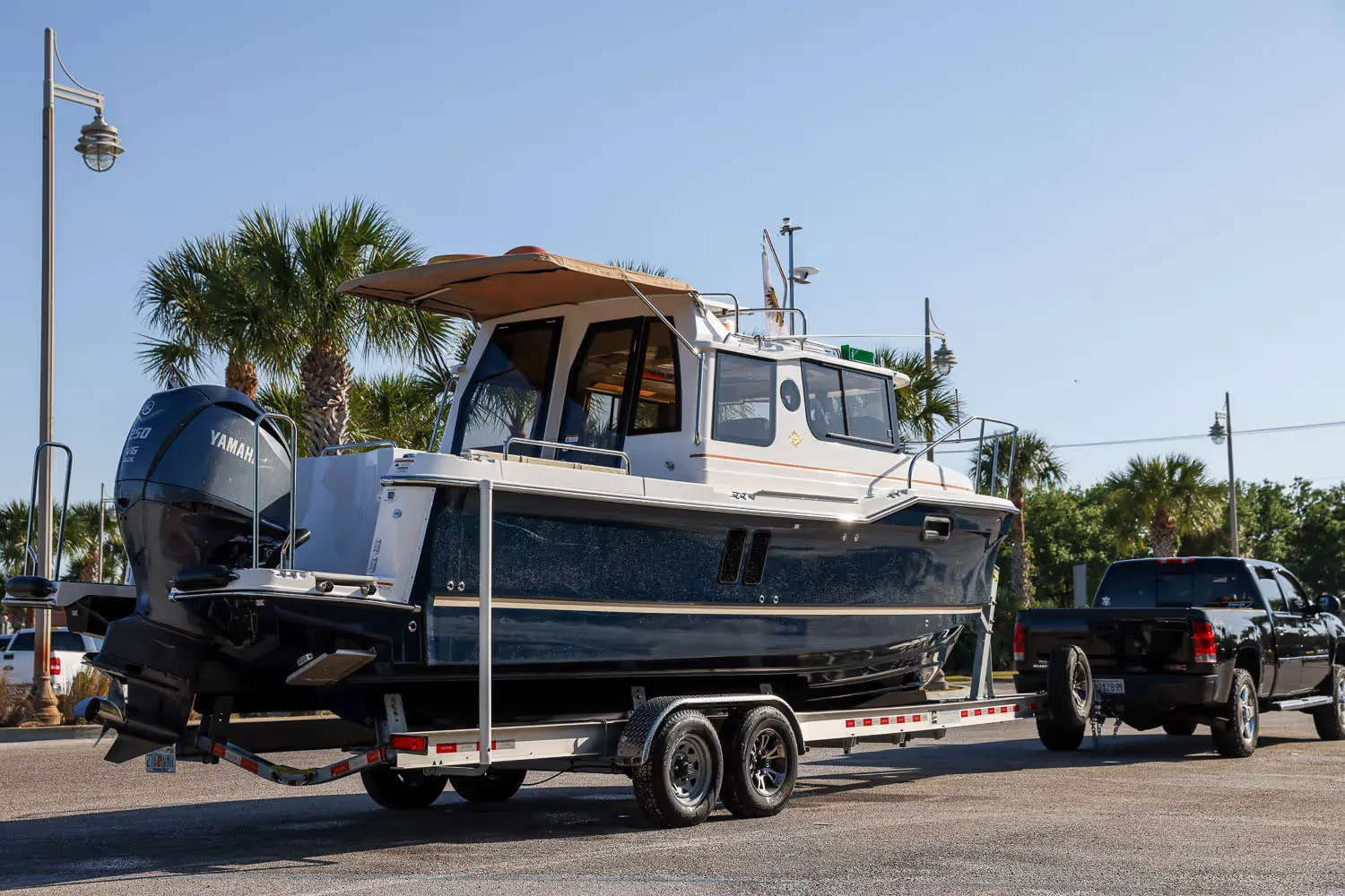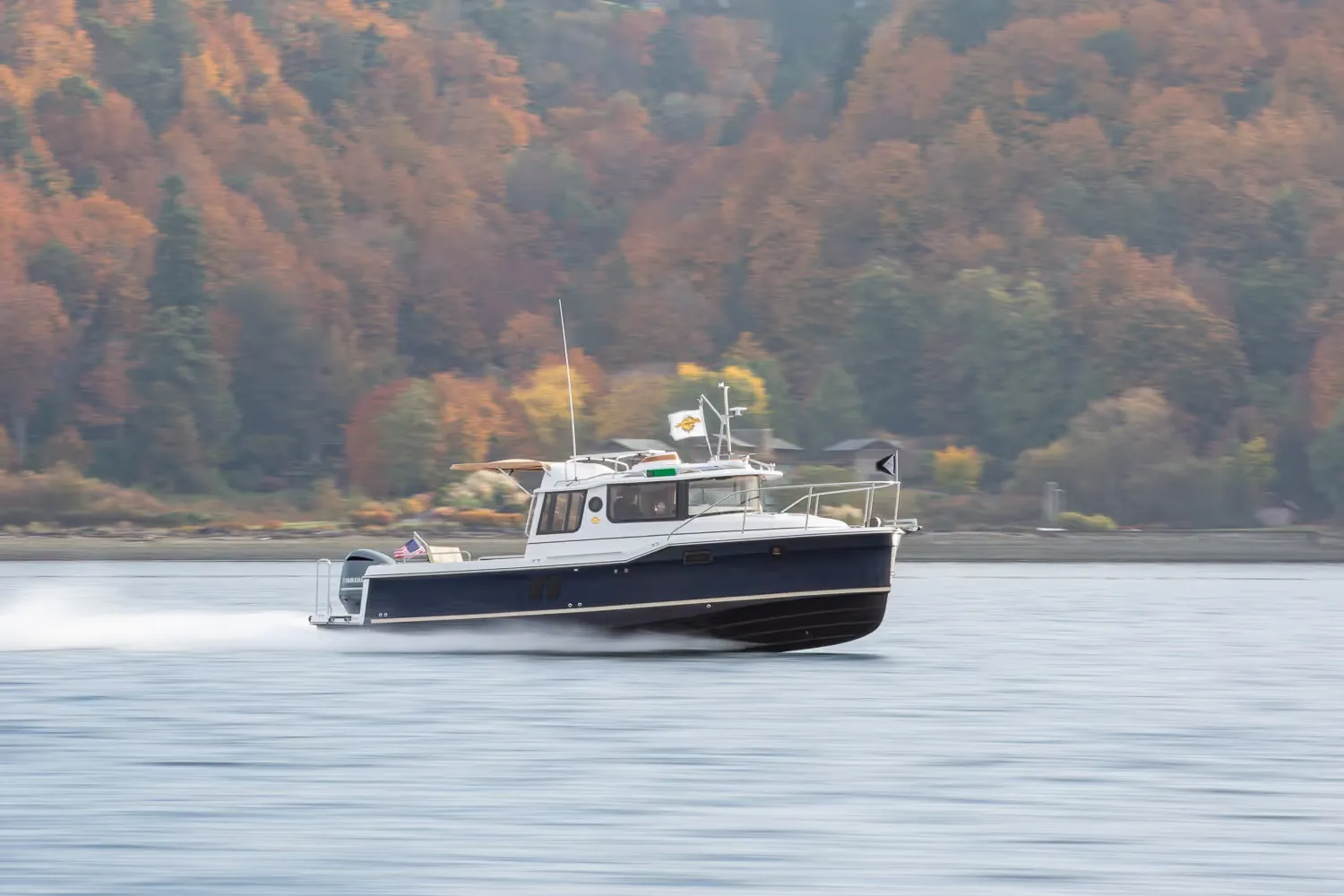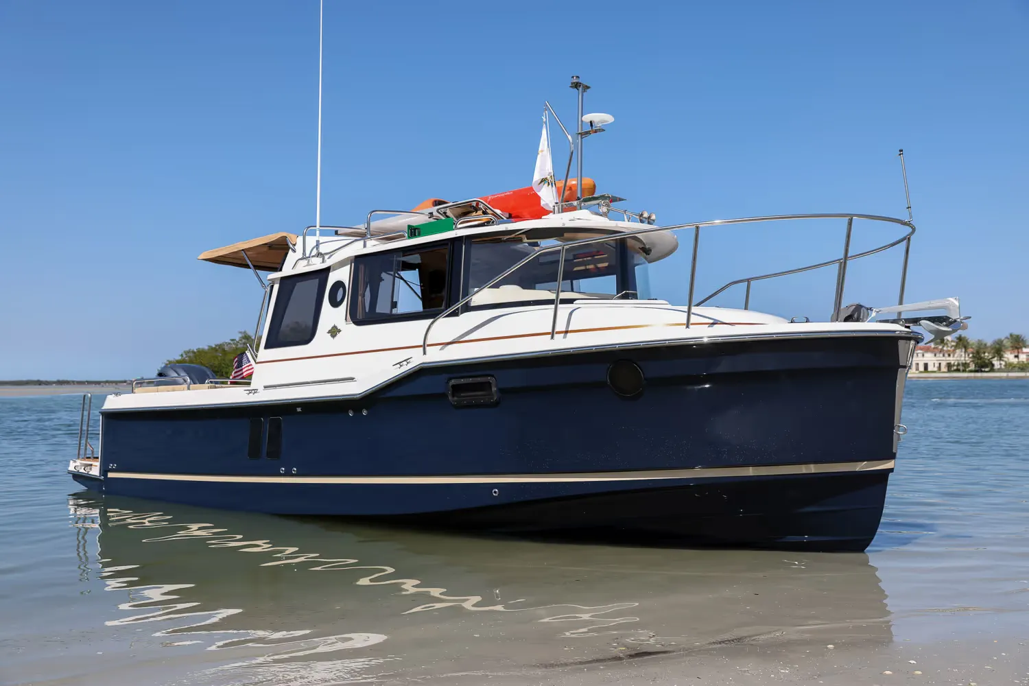 The R-25 is a feature-packed cruiser designed for comfort, ease of use, and FUN! You’ll find the Ranger Tugs DNA built into every facet of the R-25’s thoughtful design. Right away you’ll notice one of the most innovative features of the R-25, our Clear-Path swim platform. The extended swim platform wraps around the outboard to present a clear walkway free of all engine rigging, which opens a whole new world of fishing, cruising, and water-sports opportunities. This exciting new design features heavy duty handrails and allows you to safely and easily board a dinghy, net a fish, step to or from a low dock (important for pets), and med-tie without fear of damaging your outboard and having to leap to the dock.