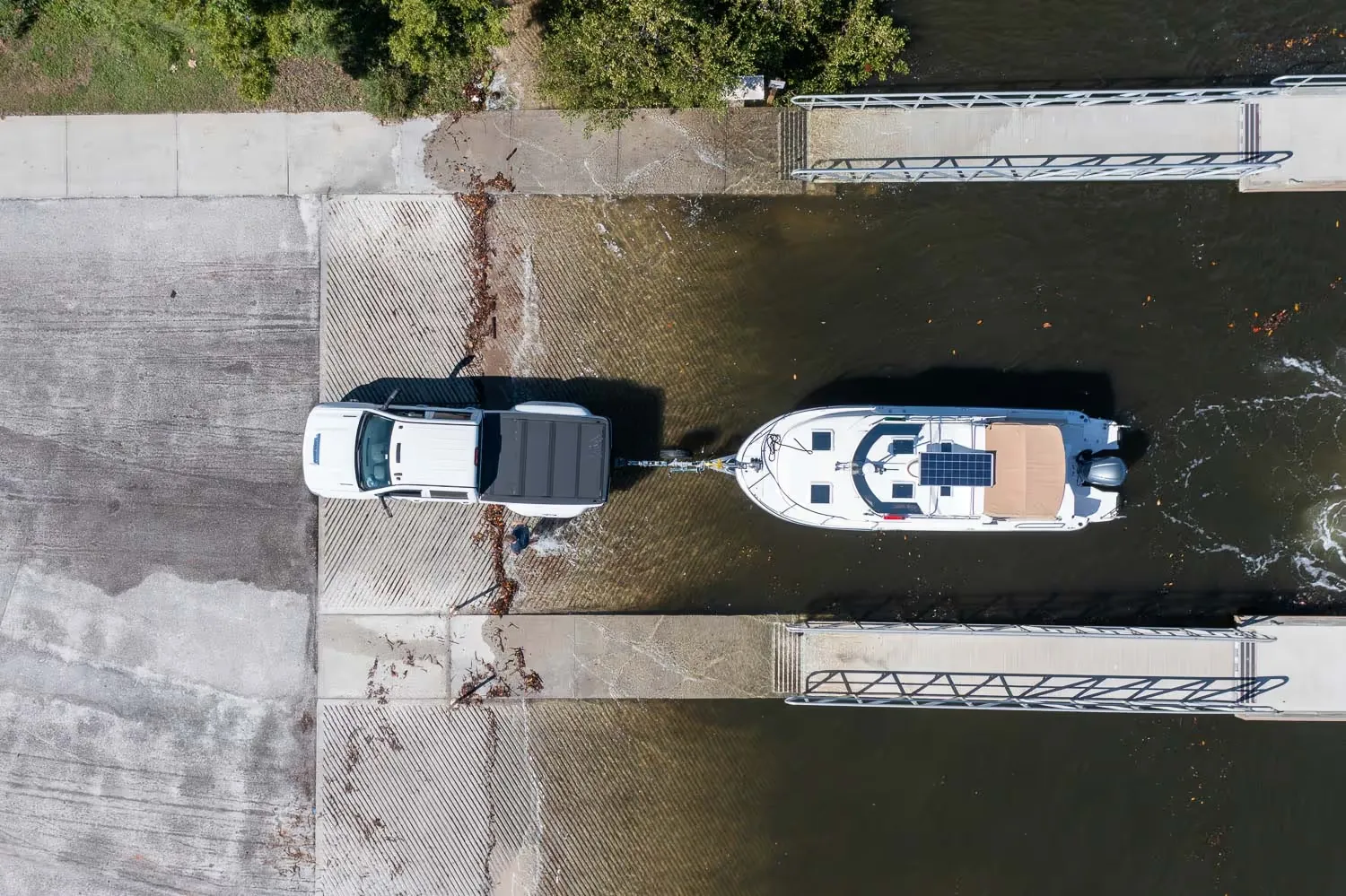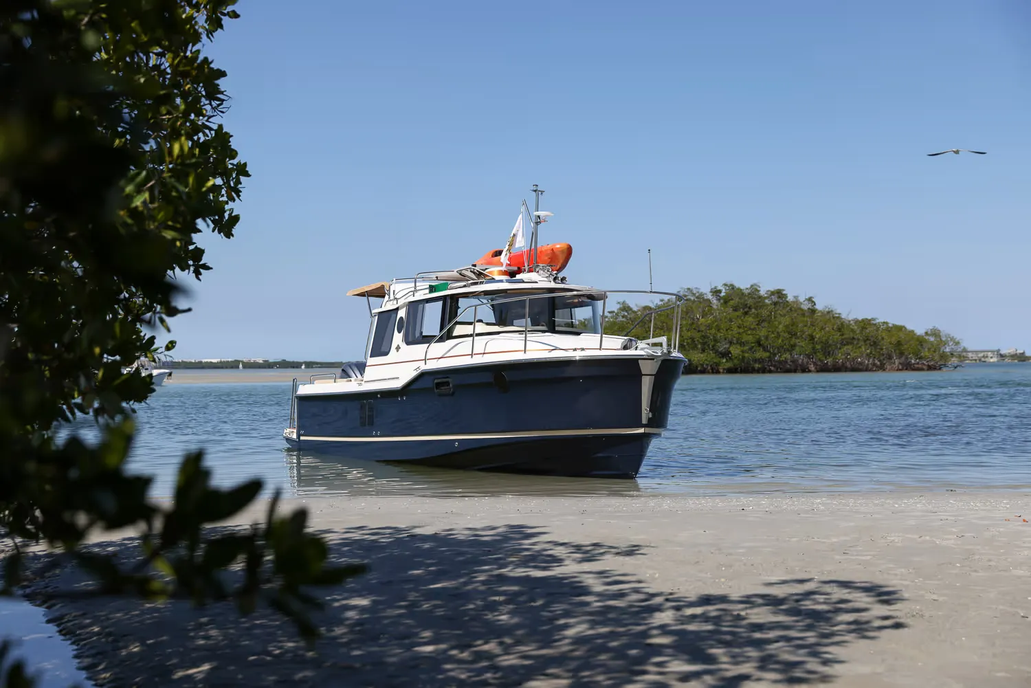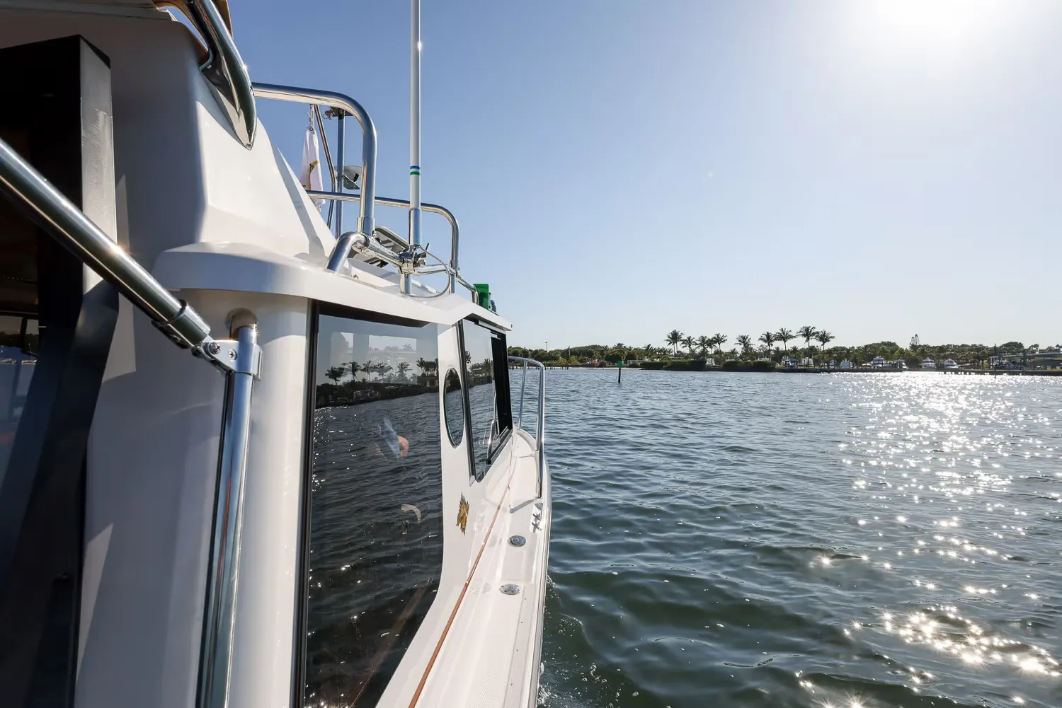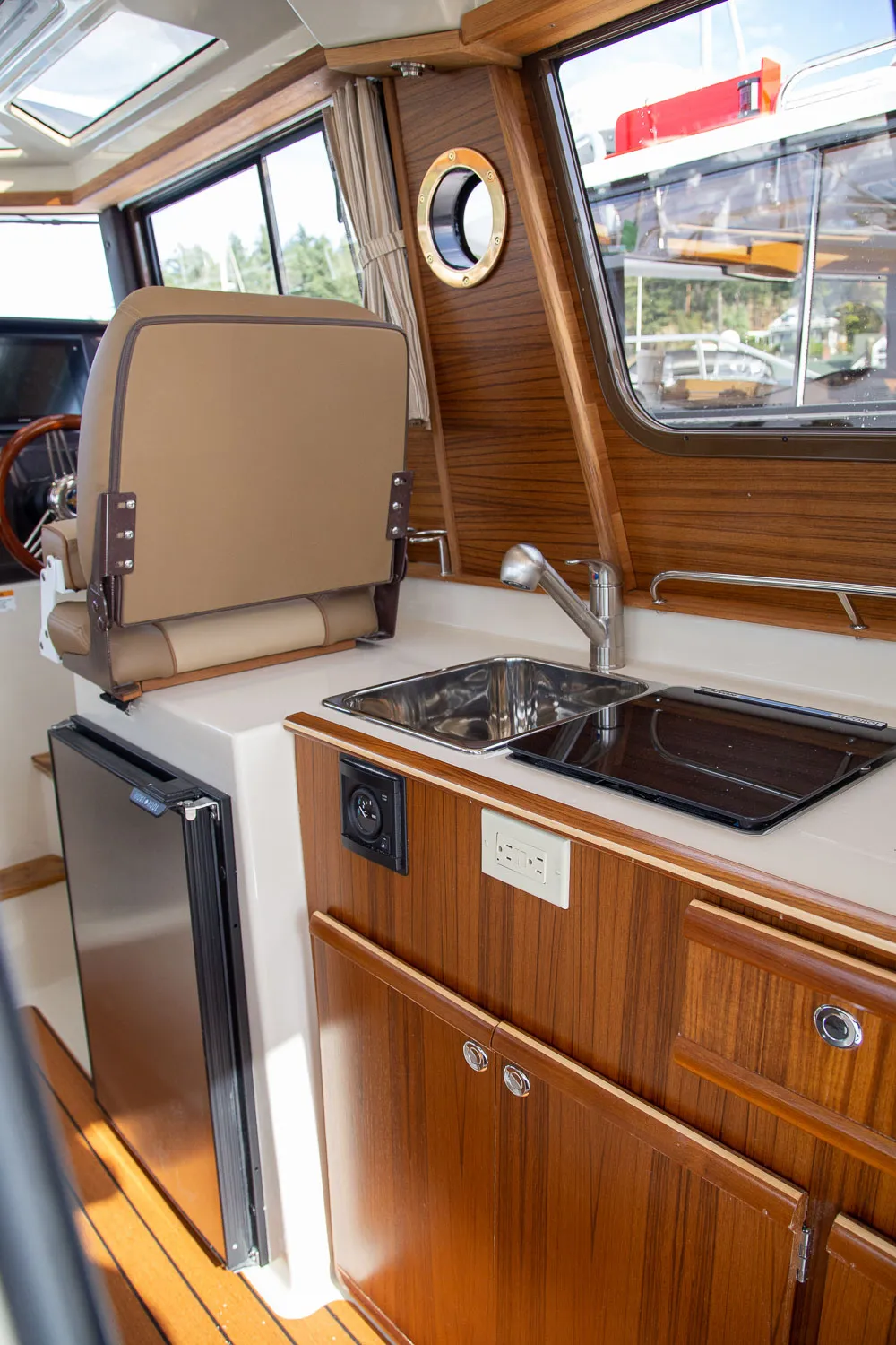 The R-25 is a feature-packed cruiser designed for comfort, ease of use, and FUN! You’ll find the Ranger Tugs DNA built into every facet of the R-25’s thoughtful design. Right away you’ll notice one of the most innovative features of the R-25, our Clear-Path swim platform. The extended swim platform wraps around the outboard to present a clear walkway free of all engine rigging, which opens a whole new world of fishing, cruising, and water-sports opportunities. This exciting new design features heavy duty handrails and allows you to safely and easily board a dinghy, net a fish, step to or from a low dock (important for pets), and med-tie without fear of damaging your outboard and having to leap to the dock.