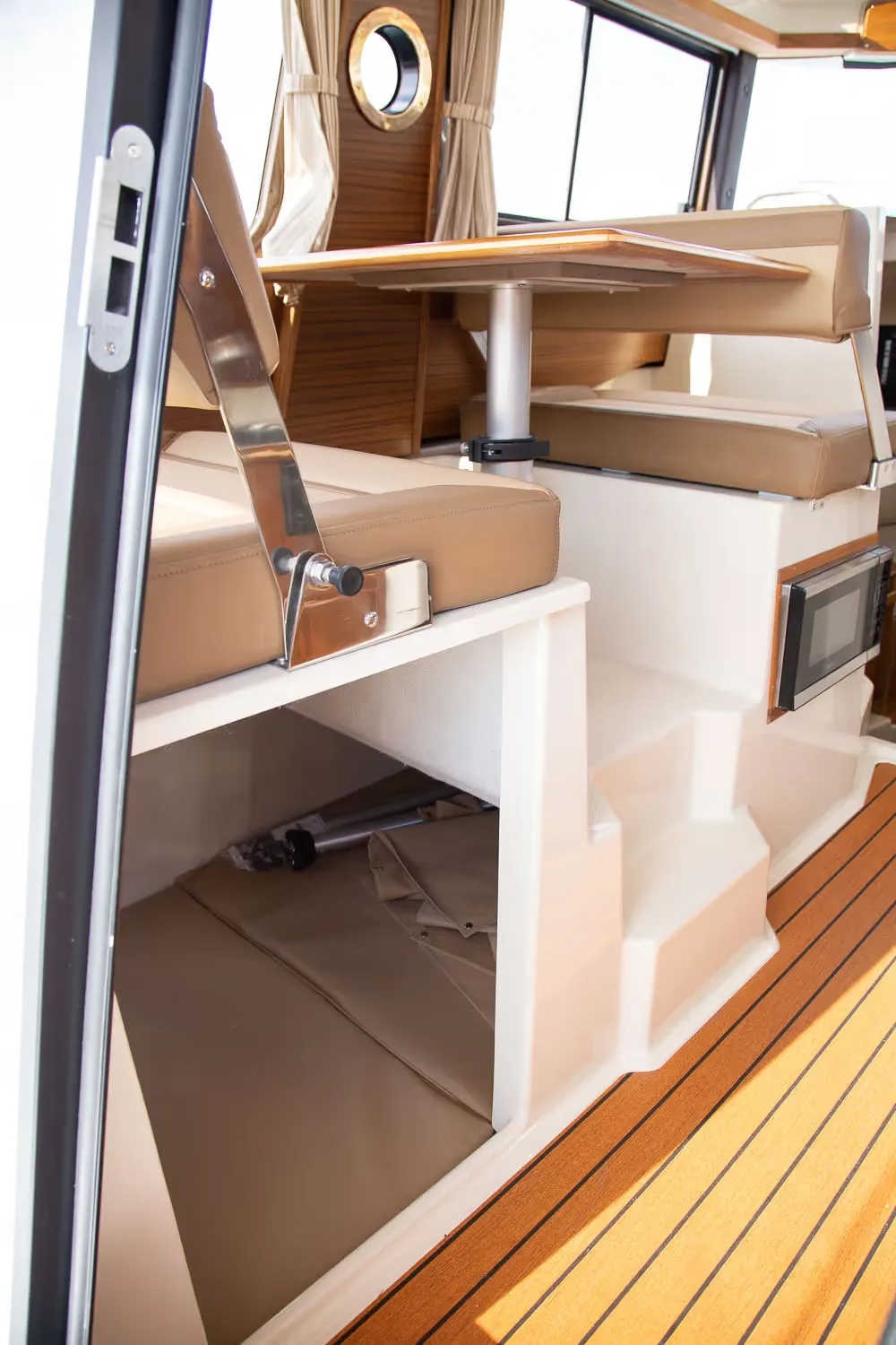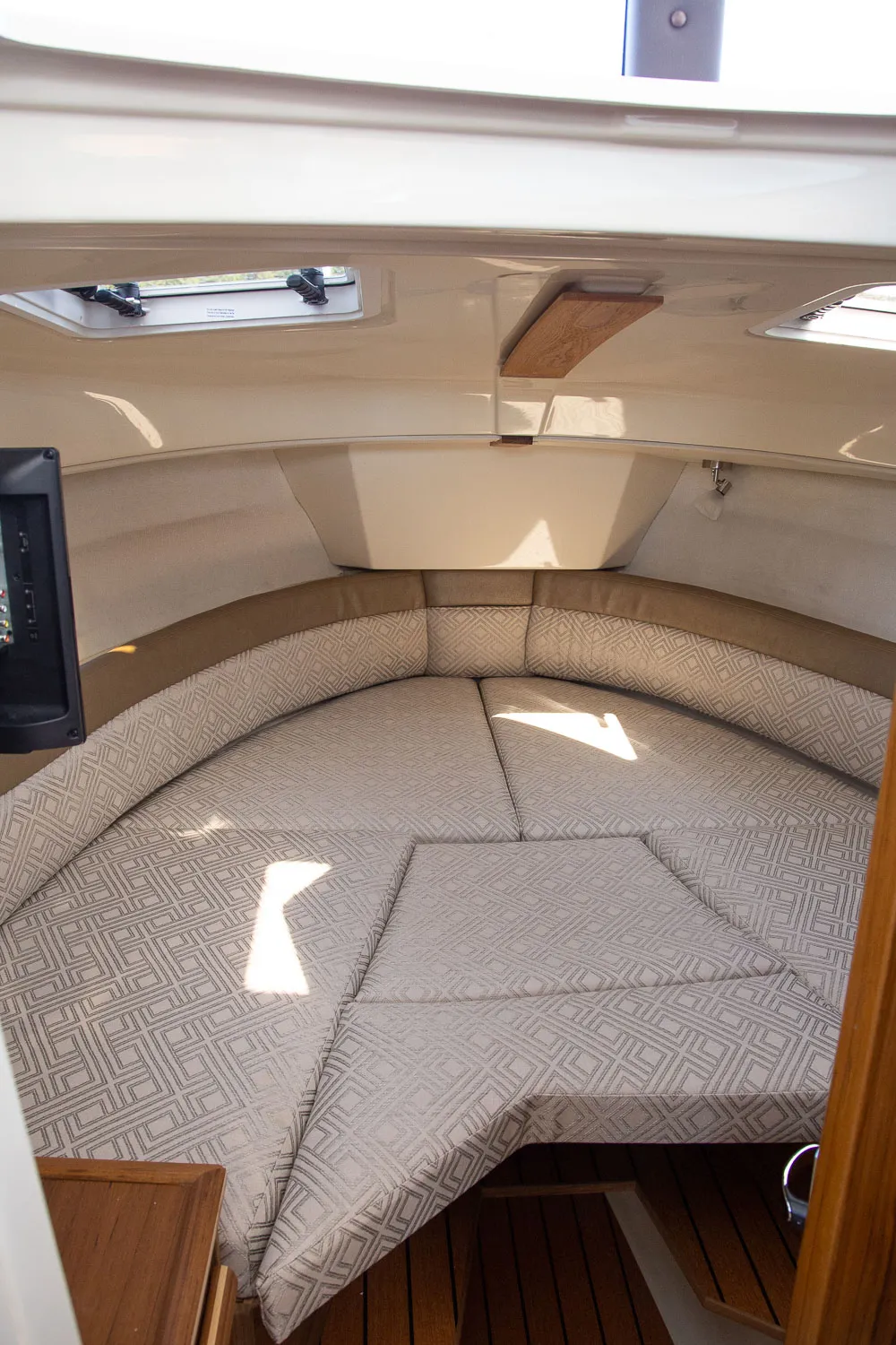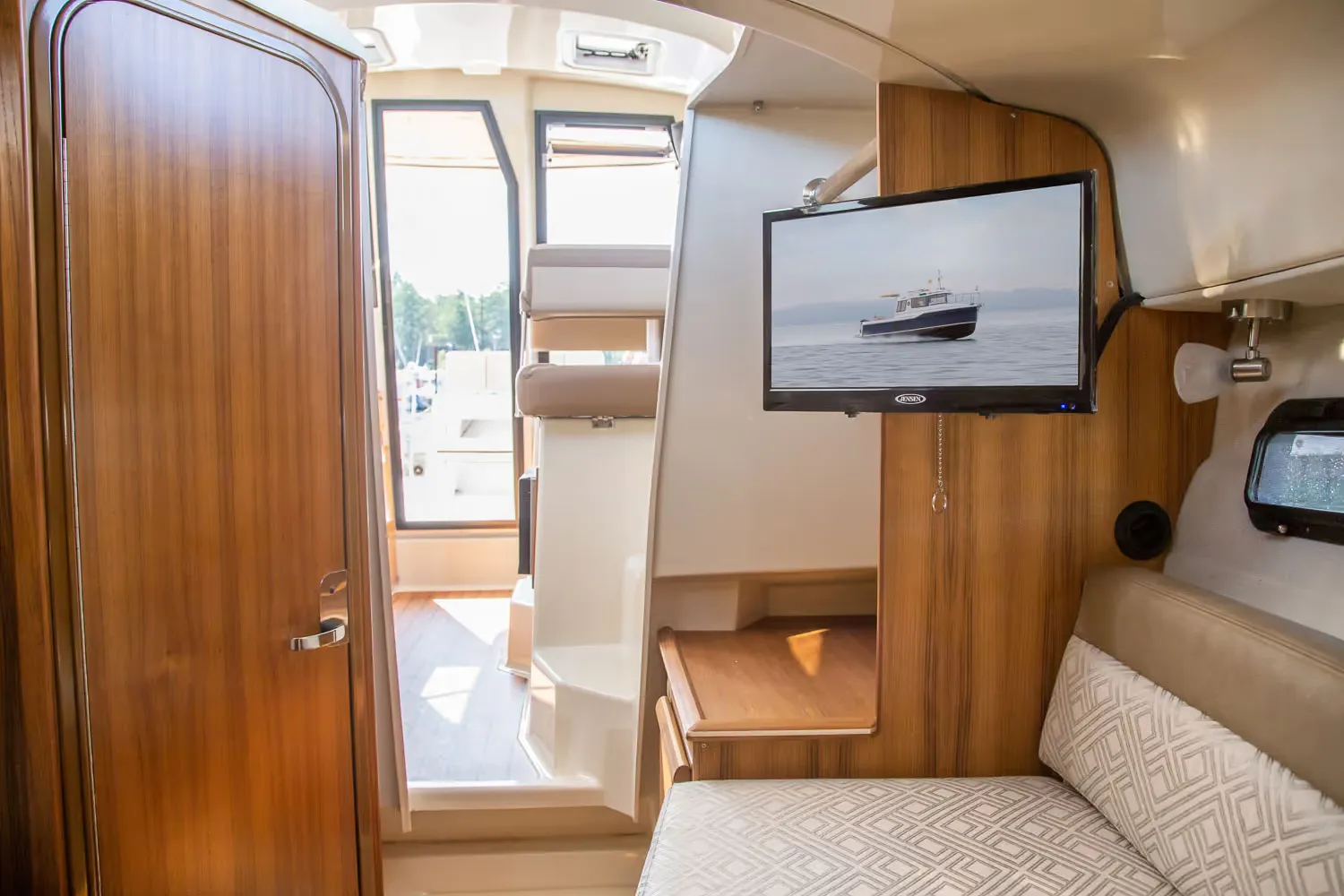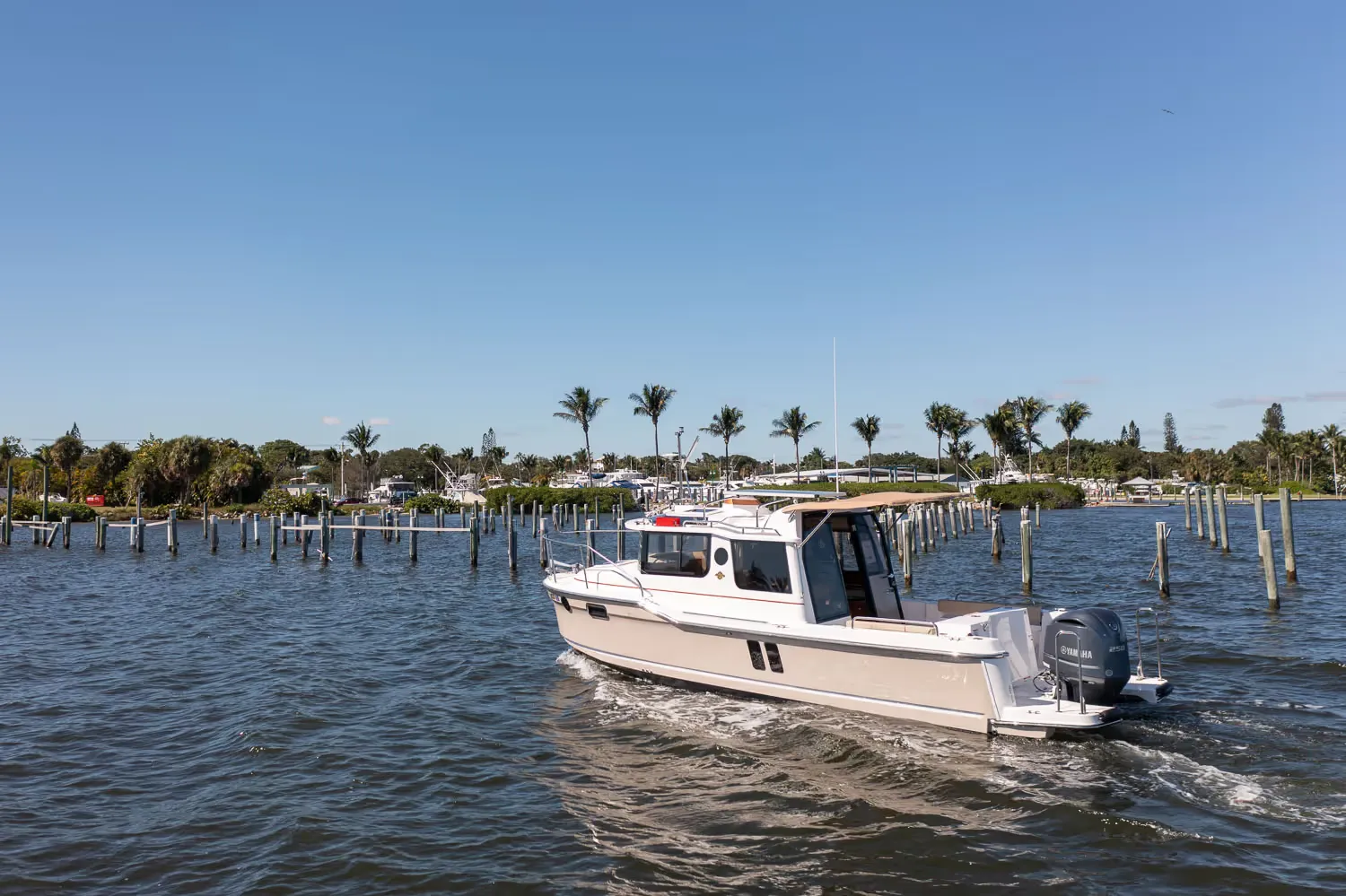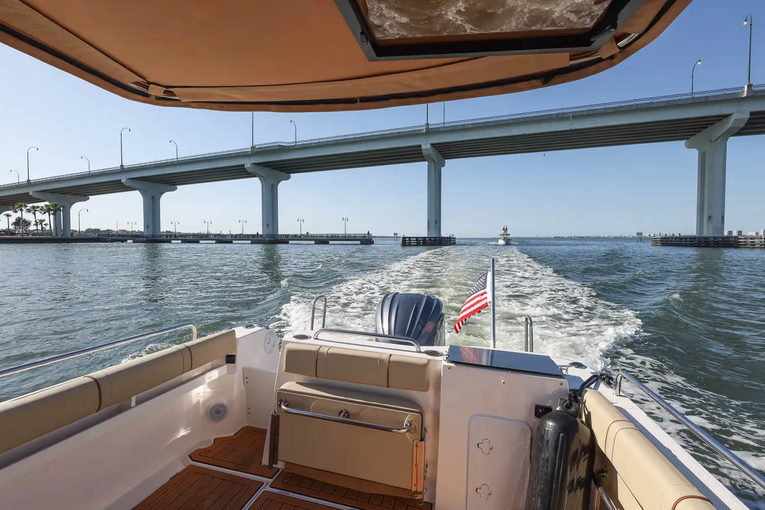 The R-25 is a feature-packed cruiser designed for comfort, ease of use, and FUN! You’ll find the Ranger Tugs DNA built into every facet of the R-25’s thoughtful design. Right away you’ll notice one of the most innovative features of the R-25, our Clear-Path swim platform. The extended swim platform wraps around the outboard to present a clear walkway free of all engine rigging, which opens a whole new world of fishing, cruising, and water-sports opportunities. This exciting new design features heavy duty handrails and allows you to safely and easily board a dinghy, net a fish, step to or from a low dock (important for pets), and med-tie without fear of damaging your outboard and having to leap to the dock.