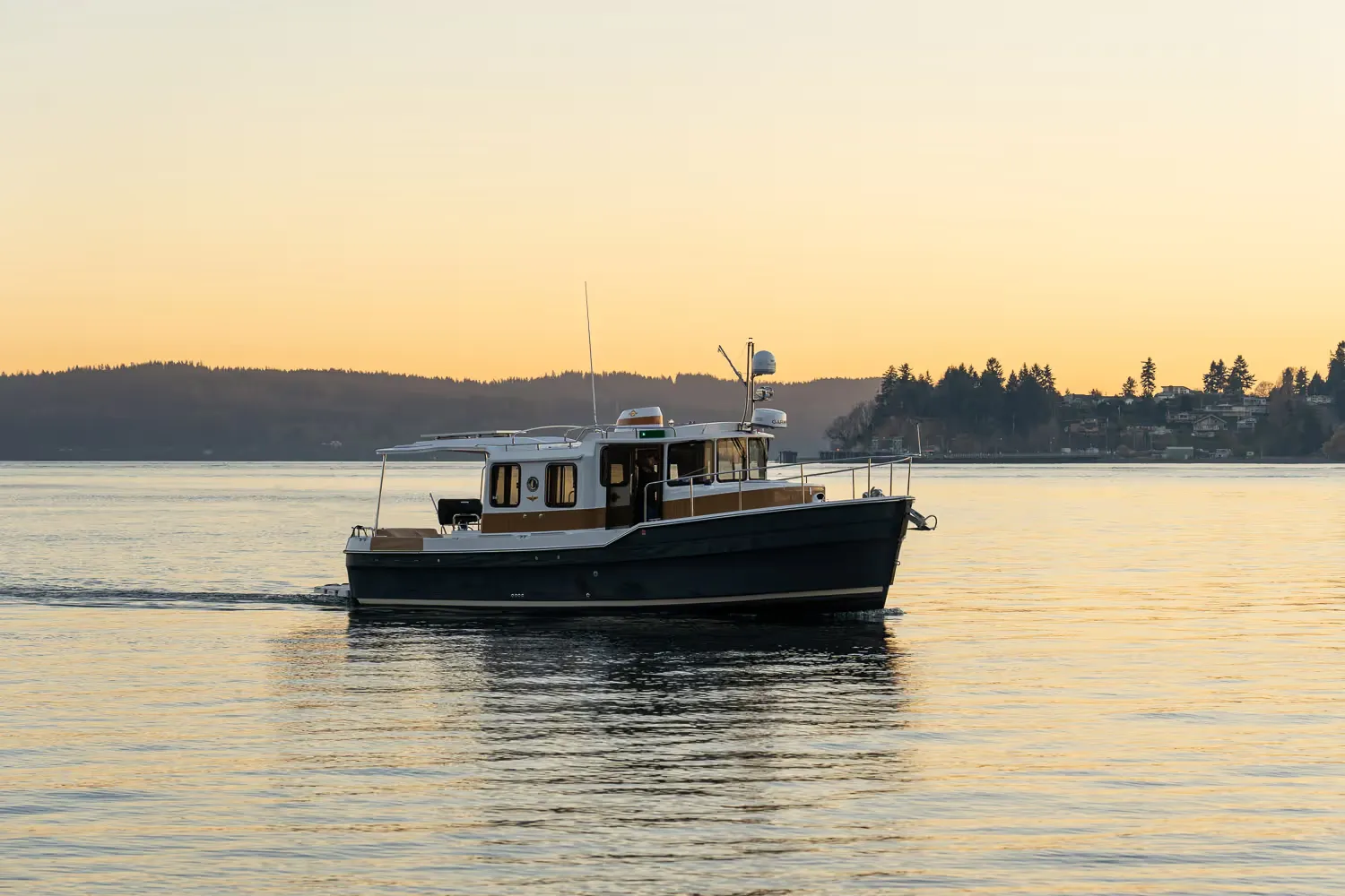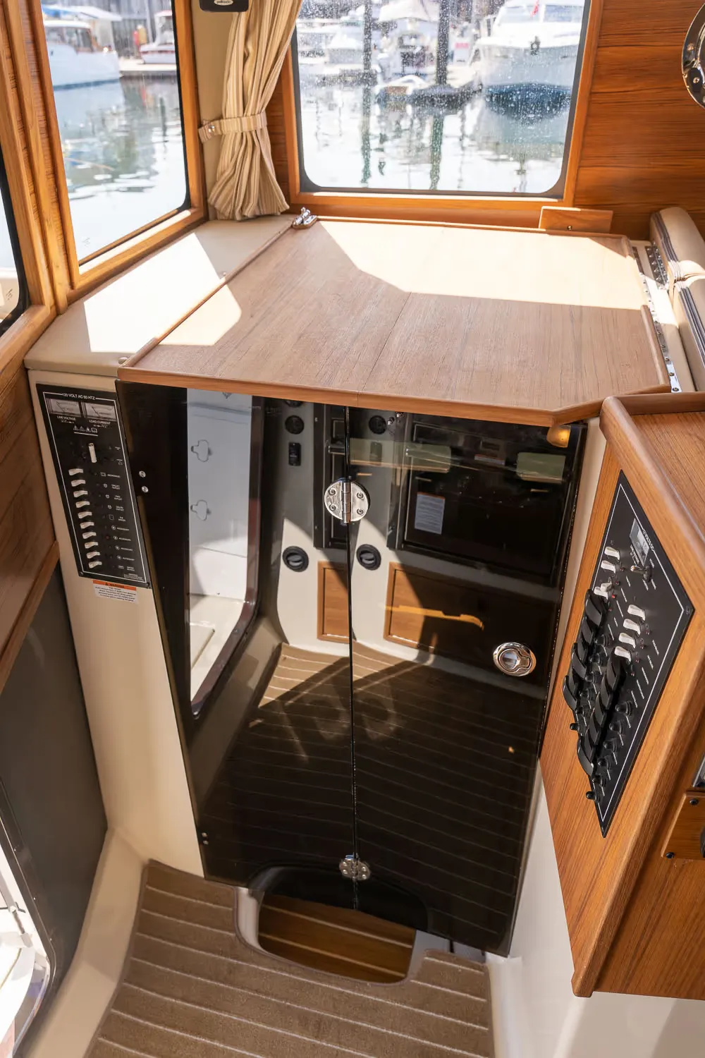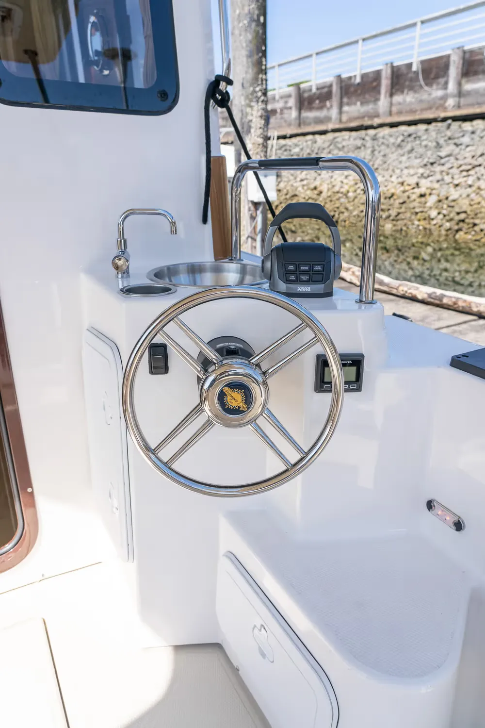 The R-31 S shares many of the features and qualities of her smaller sisterships but some notable additions to this larger model make her ideal for extended cruising while still being a trailerable trawler. The builders at Ranger Tugs equipped the foredeck with seating and a table that can be raised or lowered depending on whether the boat is under way or at anchor or dock for entertaining. In addition to the foredeck seating, the R-31 boasts a larger cockpit area with wraparound seating utilizing seats that fold out of the gunwale. When not entertaining, seats are folded leaving the cockpit unencumbered.