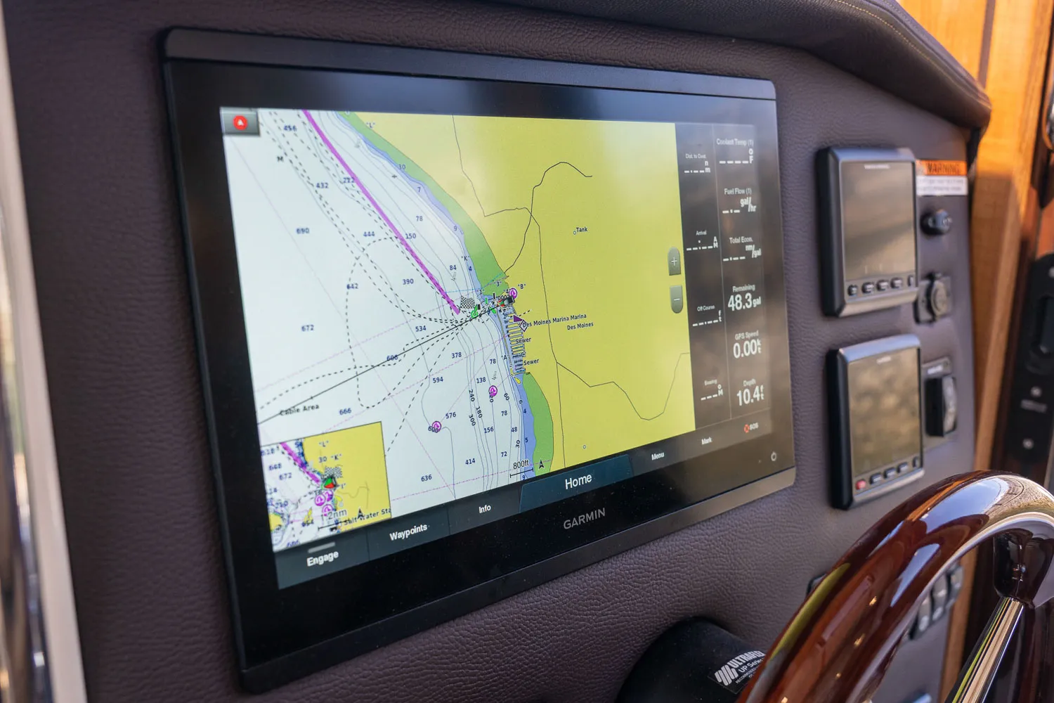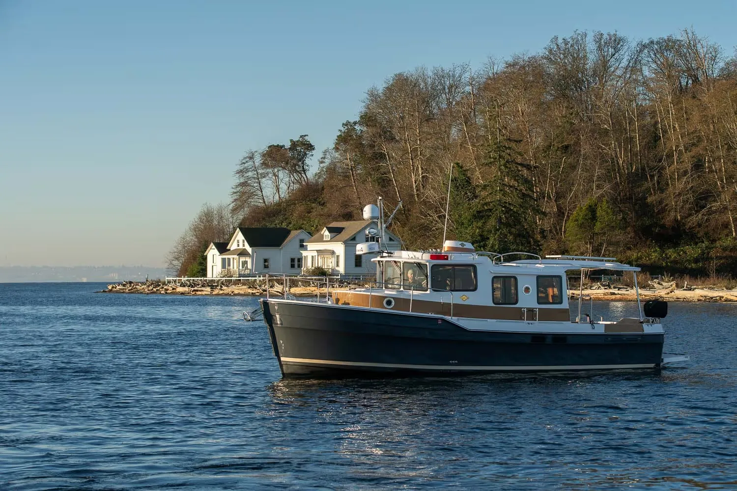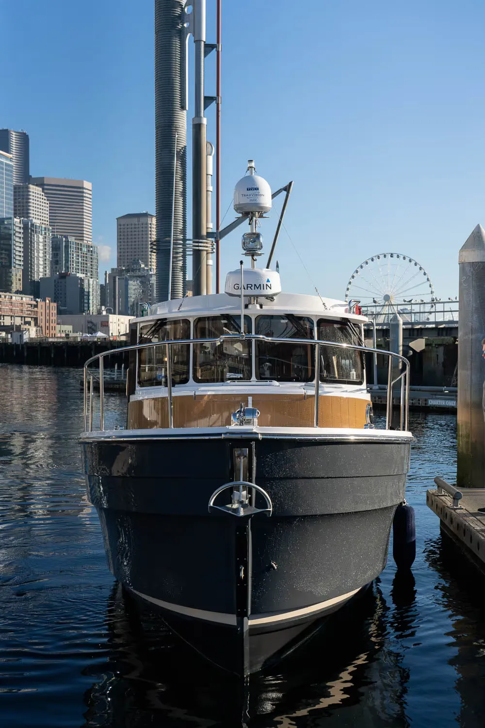 The R-31 S shares many of the features and qualities of her smaller sisterships but some notable additions to this larger model make her ideal for extended cruising while still being a trailerable trawler. The builders at Ranger Tugs equipped the foredeck with seating and a table that can be raised or lowered depending on whether the boat is under way or at anchor or dock for entertaining. In addition to the foredeck seating, the R-31 boasts a larger cockpit area with wraparound seating utilizing seats that fold out of the gunwale. When not entertaining, seats are folded leaving the cockpit unencumbered.