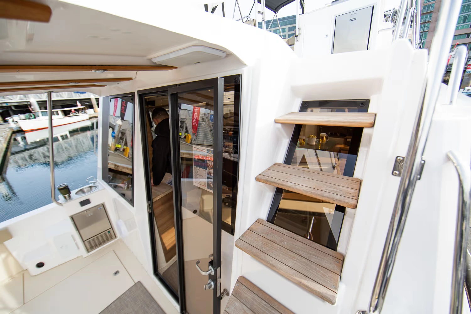 Transom entry doors for boarding