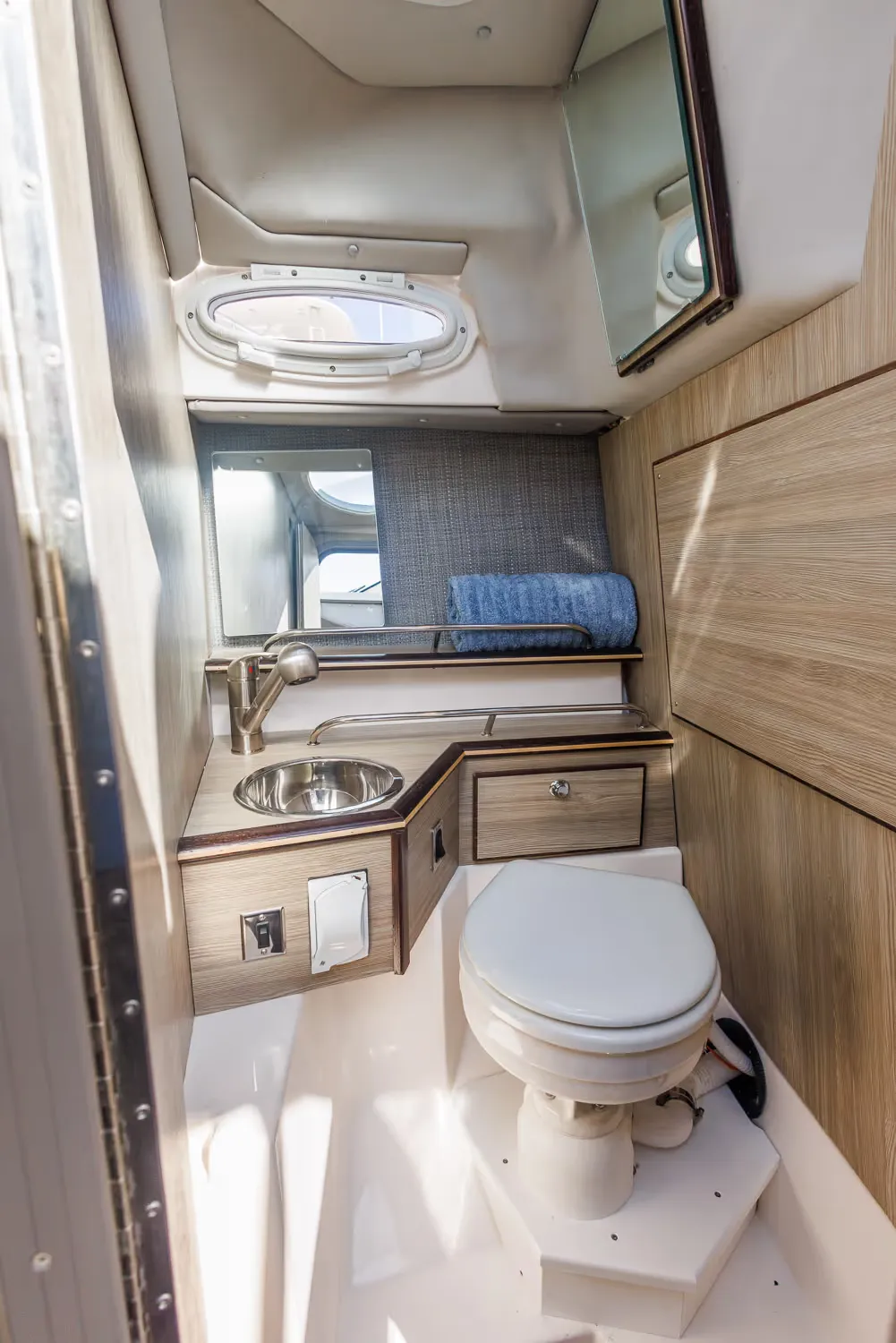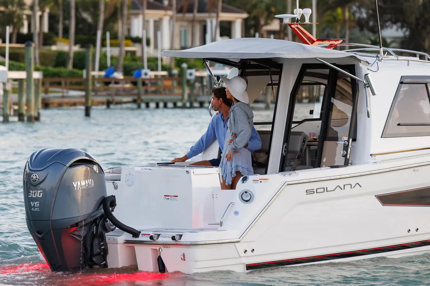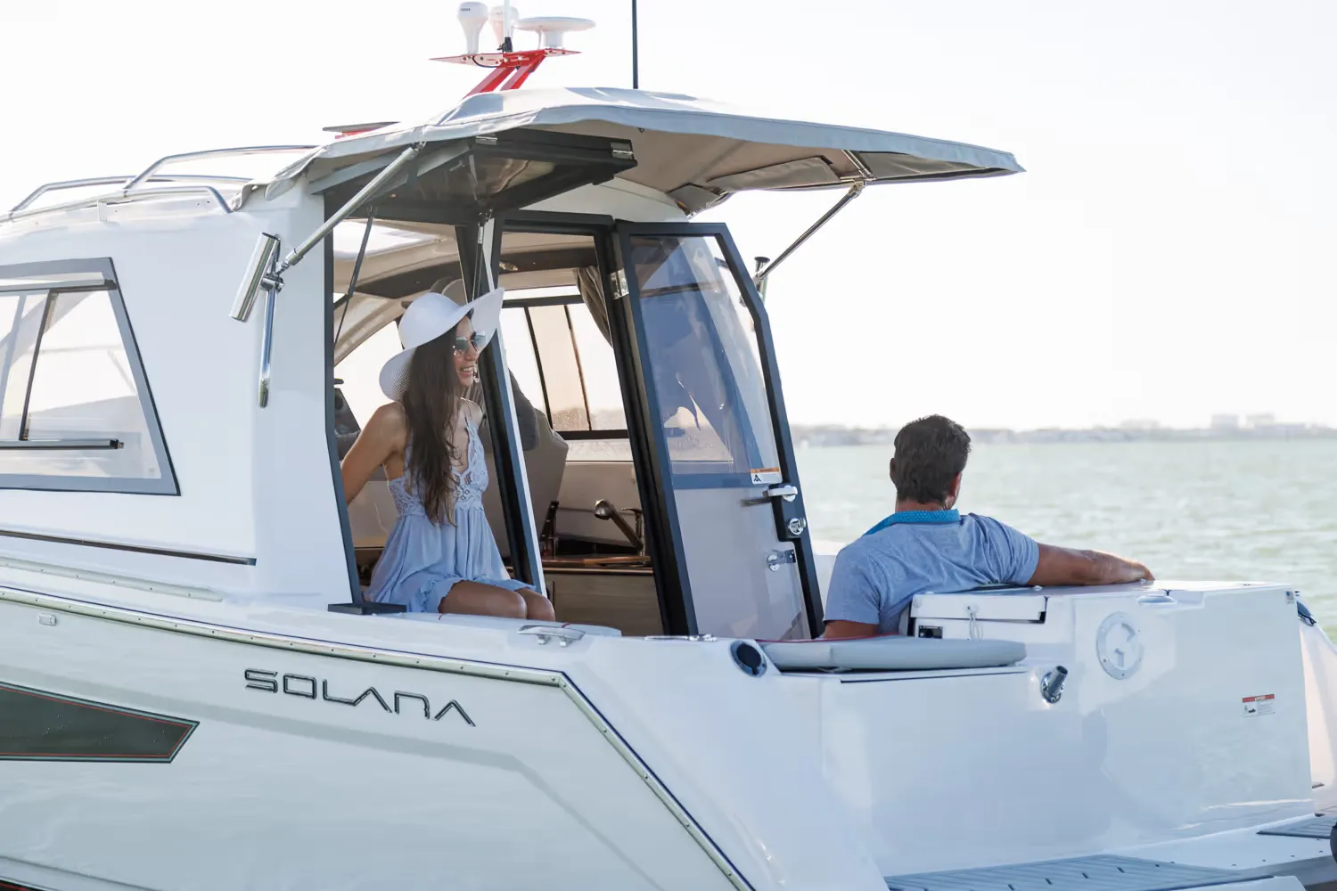 The Solara S-250 Coupe is a fully loaded luxury pocket cruiser perfect for overnighting, fishing, watersports, and day cruising. The S-250 C includes many of the amenities found on larger yachts, in a compact package. Meal prep is fun and easy in the full galley featuring a stainless-steel sink with hot and cold water, refrigerator/freezer, stove top, microwave, and plenty of storage space. This comfortable cruiser even has a private stateroom with an enclosed head and shower!