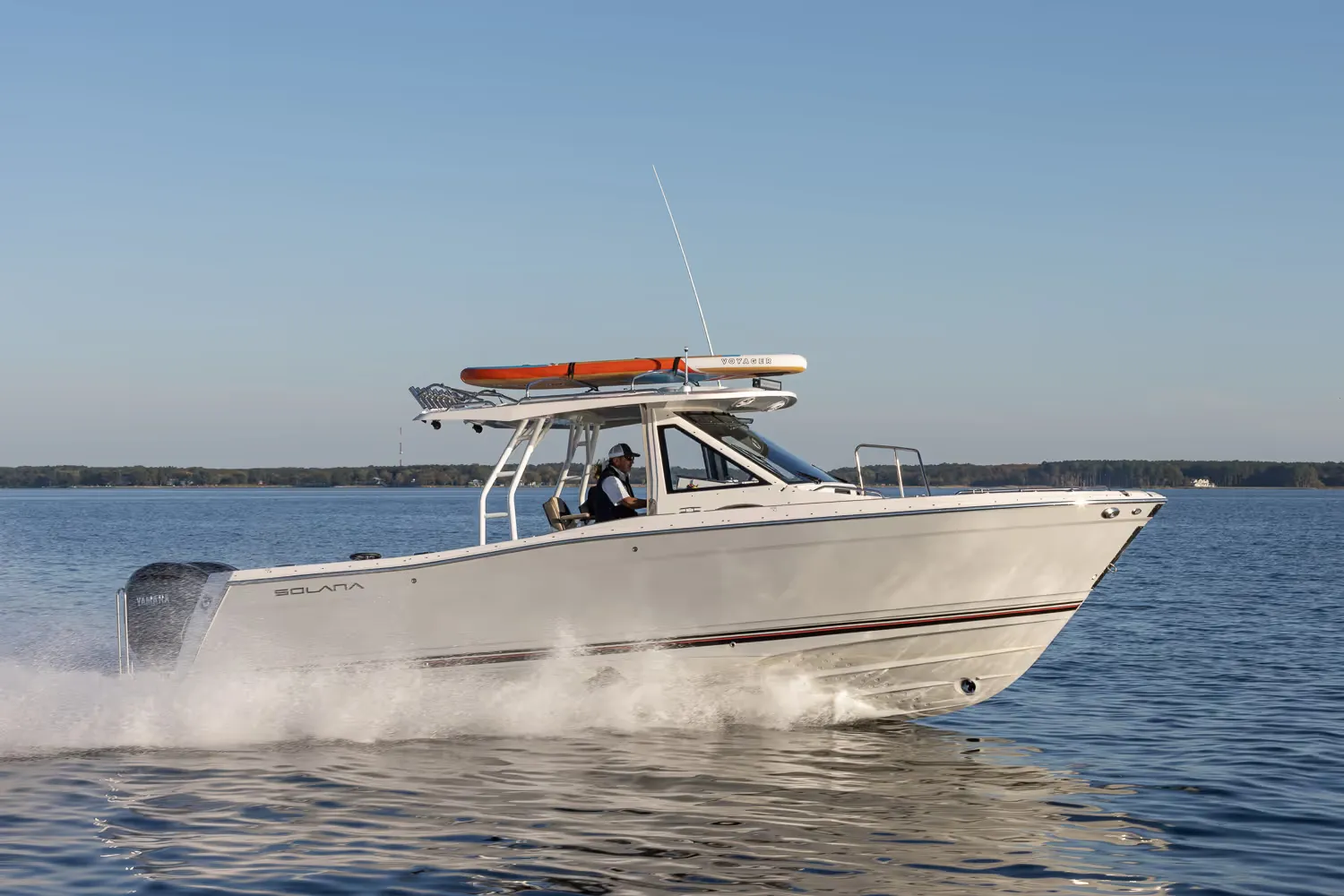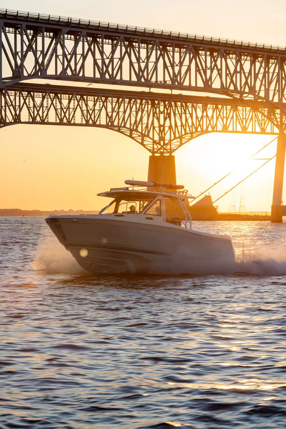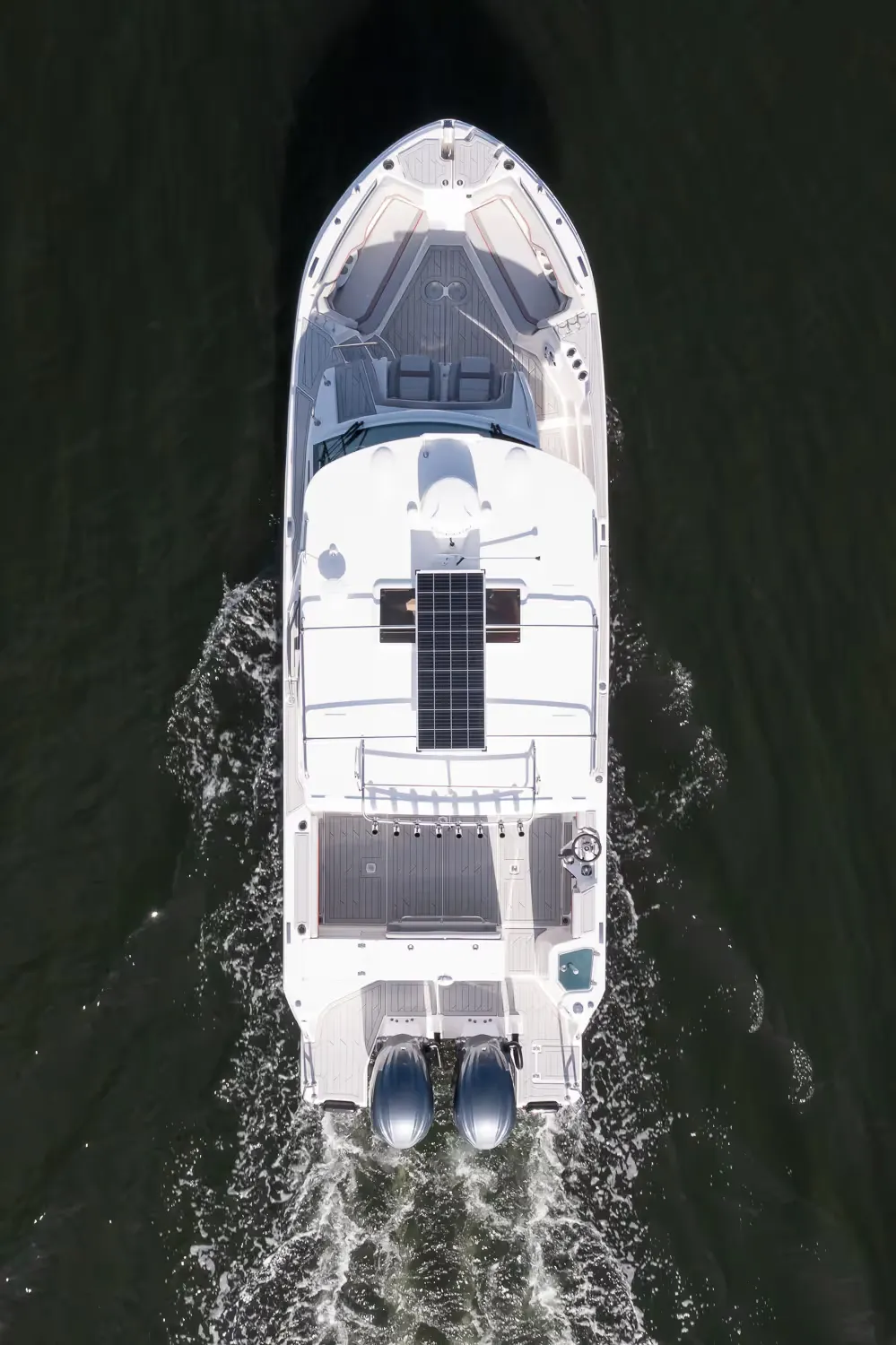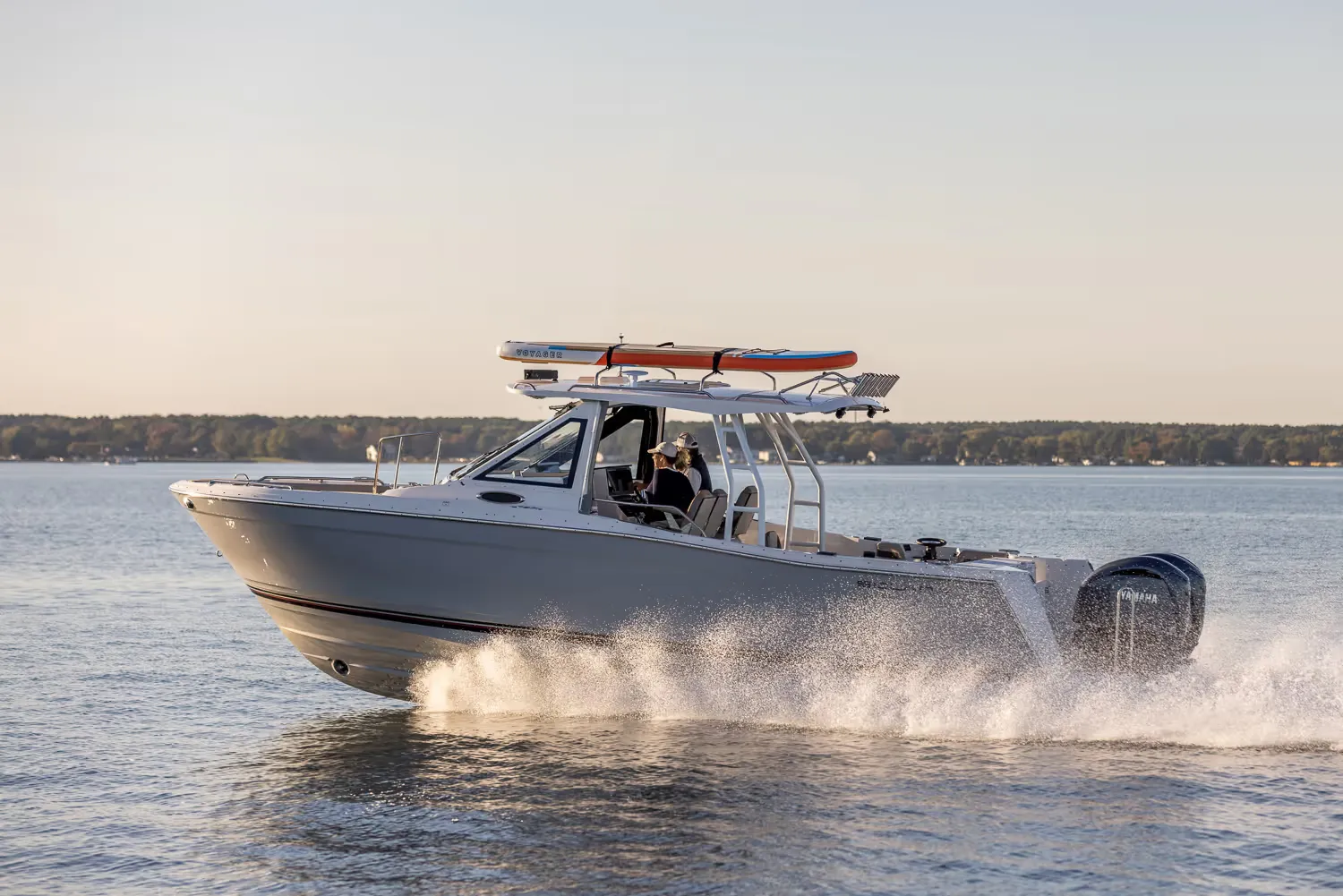 The S-310 Center Walkaround brings unmatched versatility in an agile and sporty platform. Built to excel at fishing, overnighting and entertaining guests in style, you’ll find features to enhance every experience. Powered by twin Yamaha F300 outboards, the S-310 CW delivers exceptional performance and speed. Quick planing ability and high efficiency are afforded by an advanced double stepped hull. Our uniquely designed Laminar Flow Interrupters provide outstanding cornering ability. The deep V forward and tapered bow flare allow the S-310 CW to handle rough water with ease.