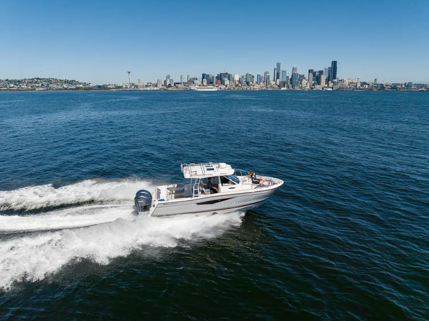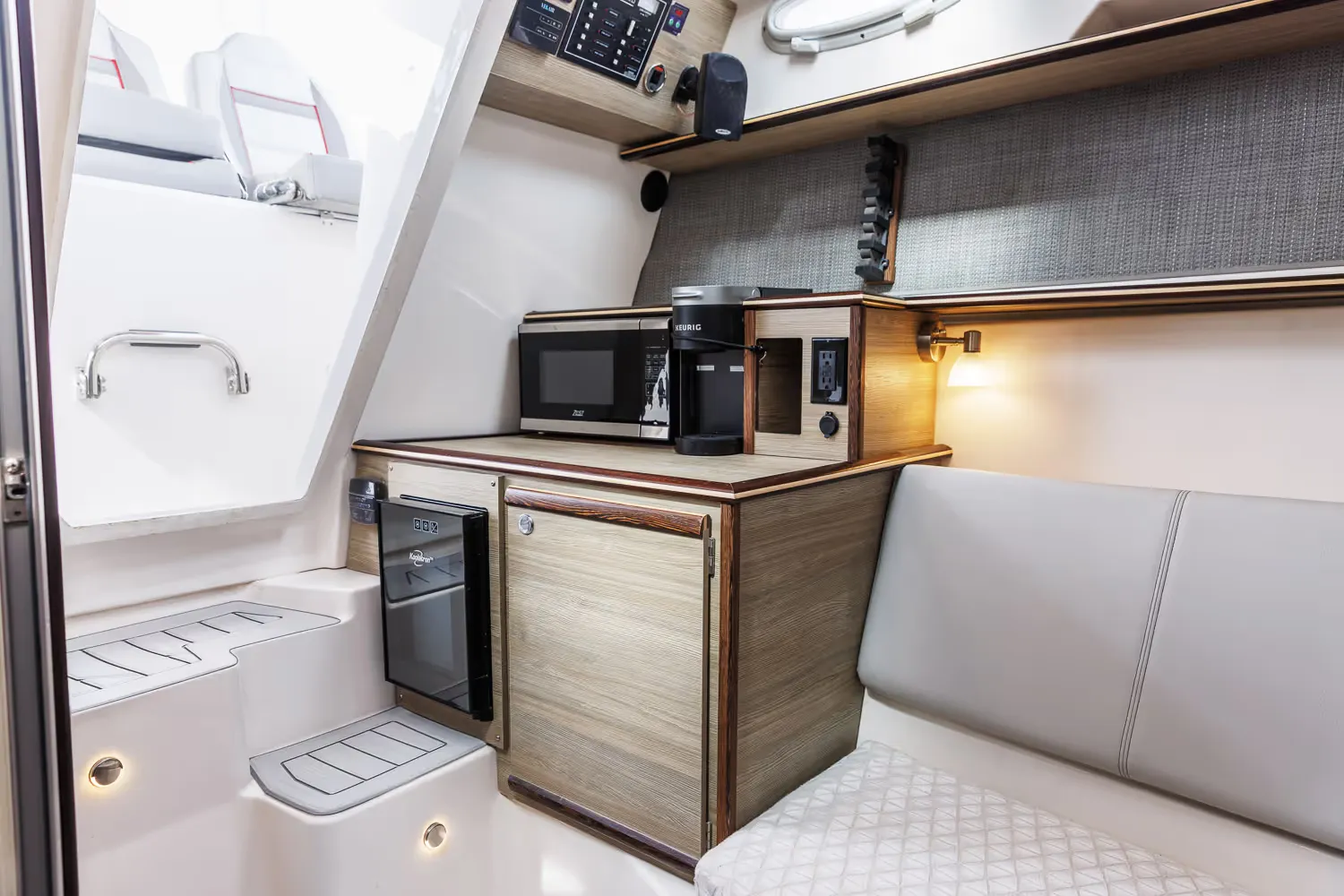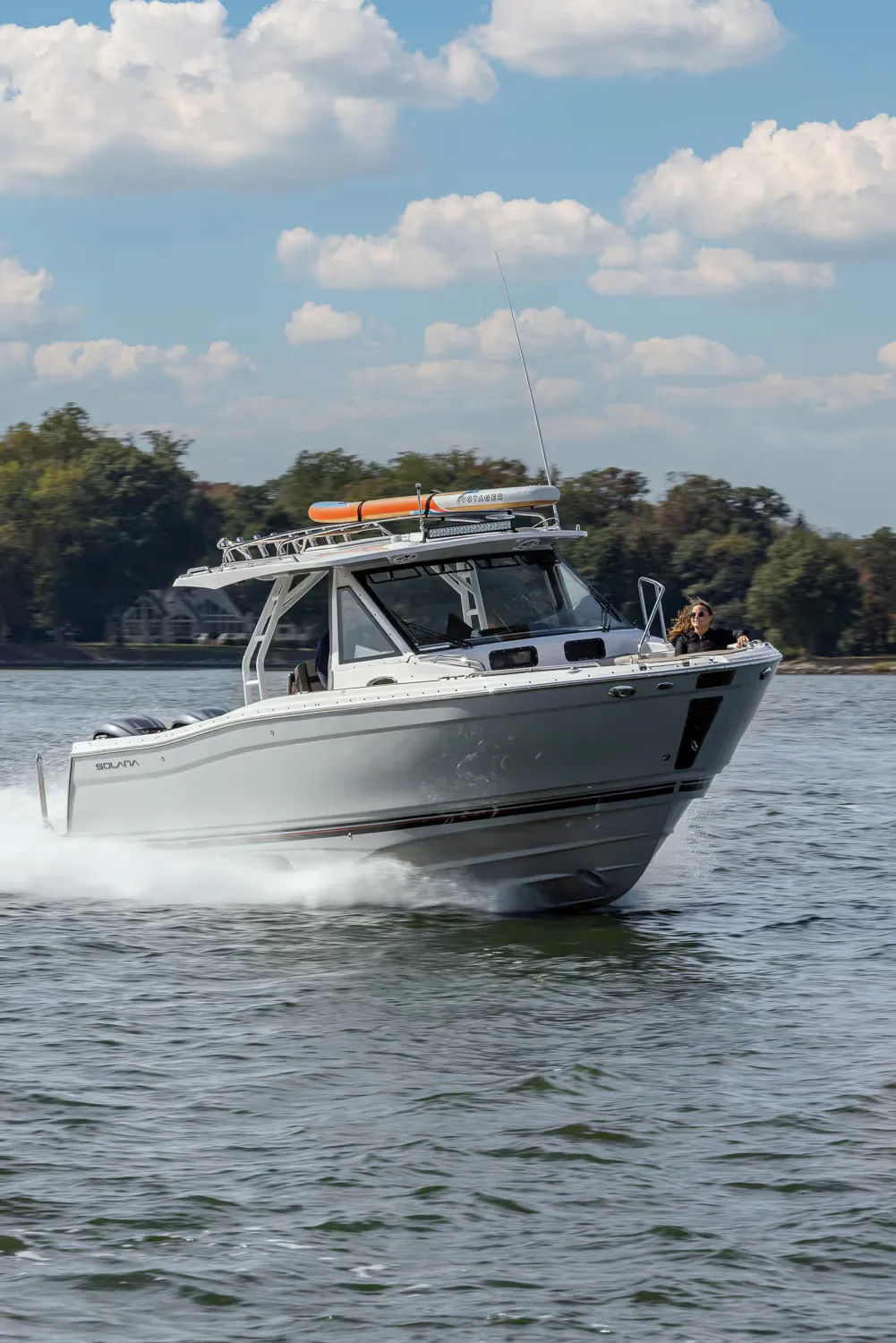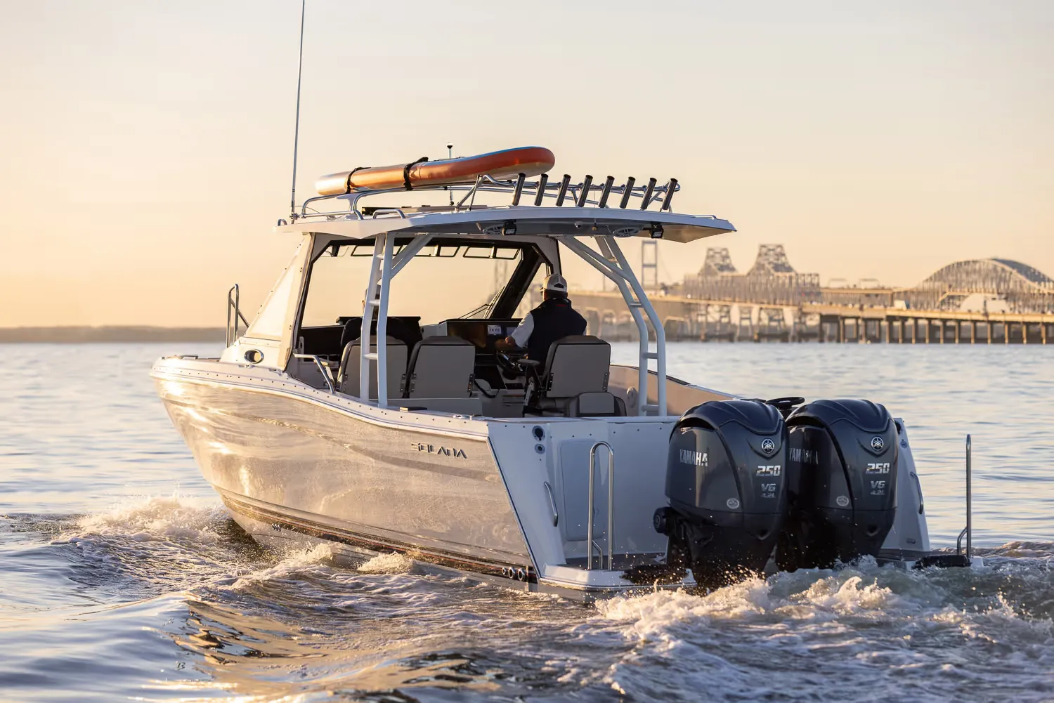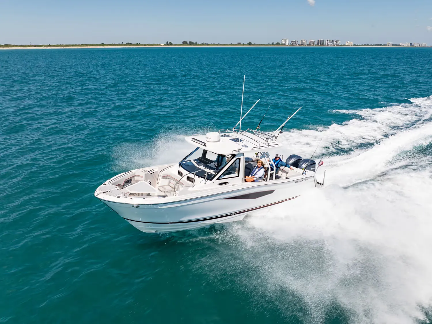 The S-310 Center Walkaround brings unmatched versatility in an agile and sporty platform. Built to excel at fishing, overnighting and entertaining guests in style, you’ll find features to enhance every experience. Powered by twin Yamaha F300 outboards, the S-310 CW delivers exceptional performance and speed. Quick planing ability and high efficiency are afforded by an advanced double stepped hull. Our uniquely designed Laminar Flow Interrupters provide outstanding cornering ability. The deep V forward and tapered bow flare allow the S-310 CW to handle rough water with ease.