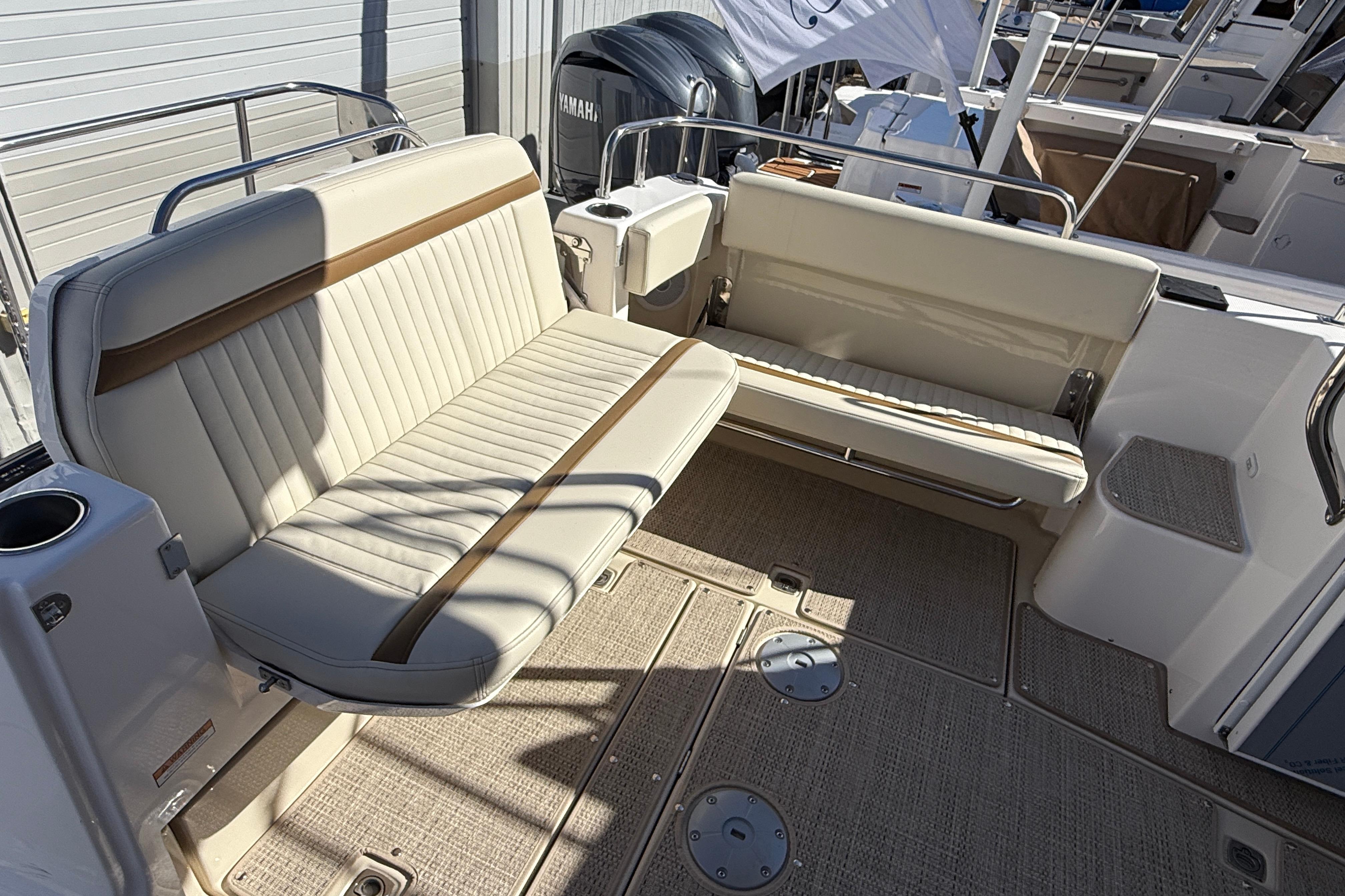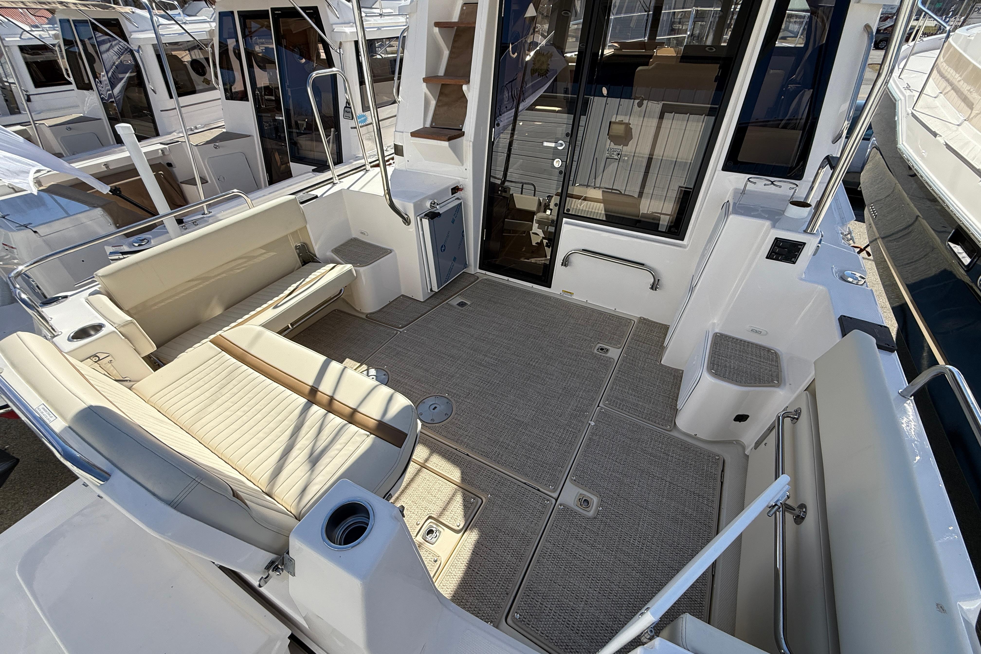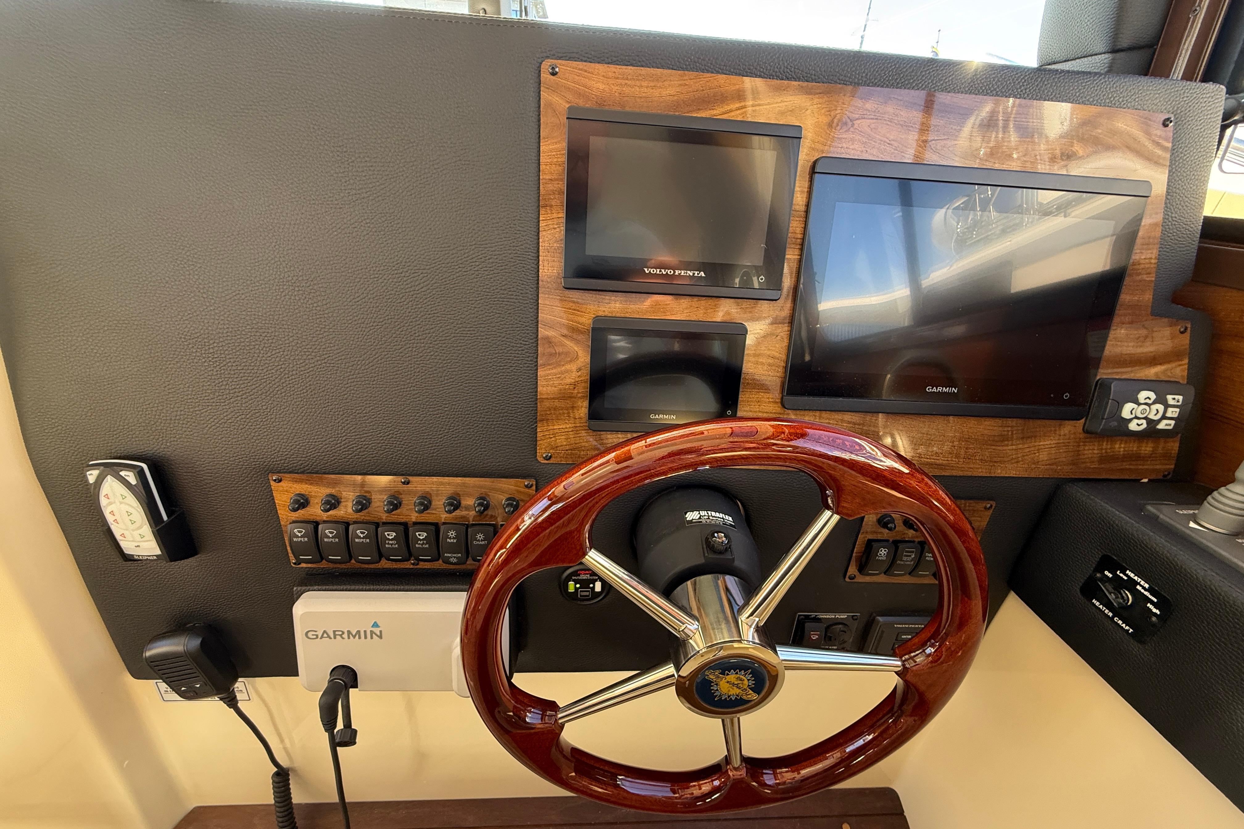 The cockpit is versatile and well-laid out, with seating options, storage, and easy access to the swim platform. It works just as well for entertaining as it does for fishing or anchoring out.