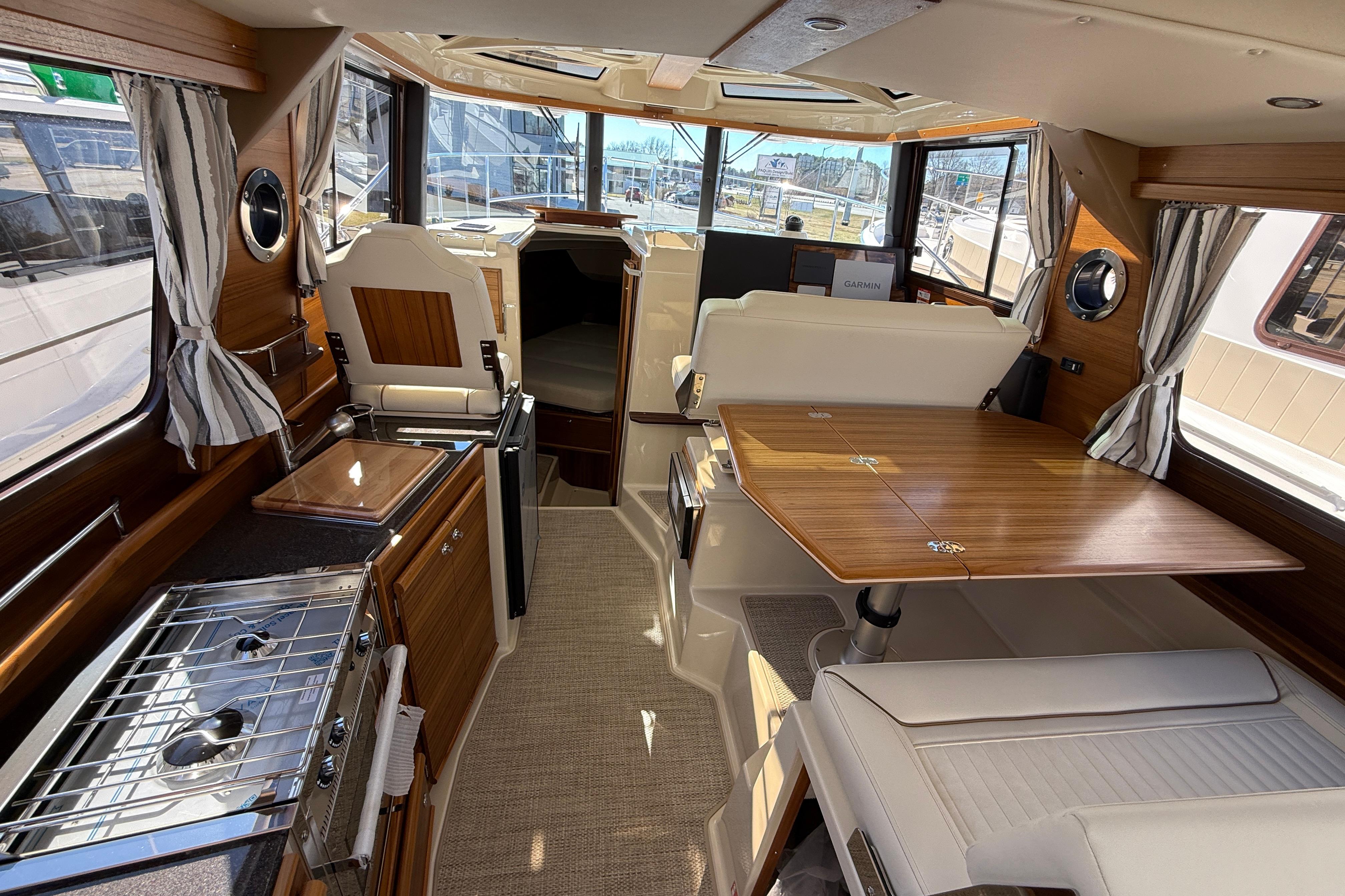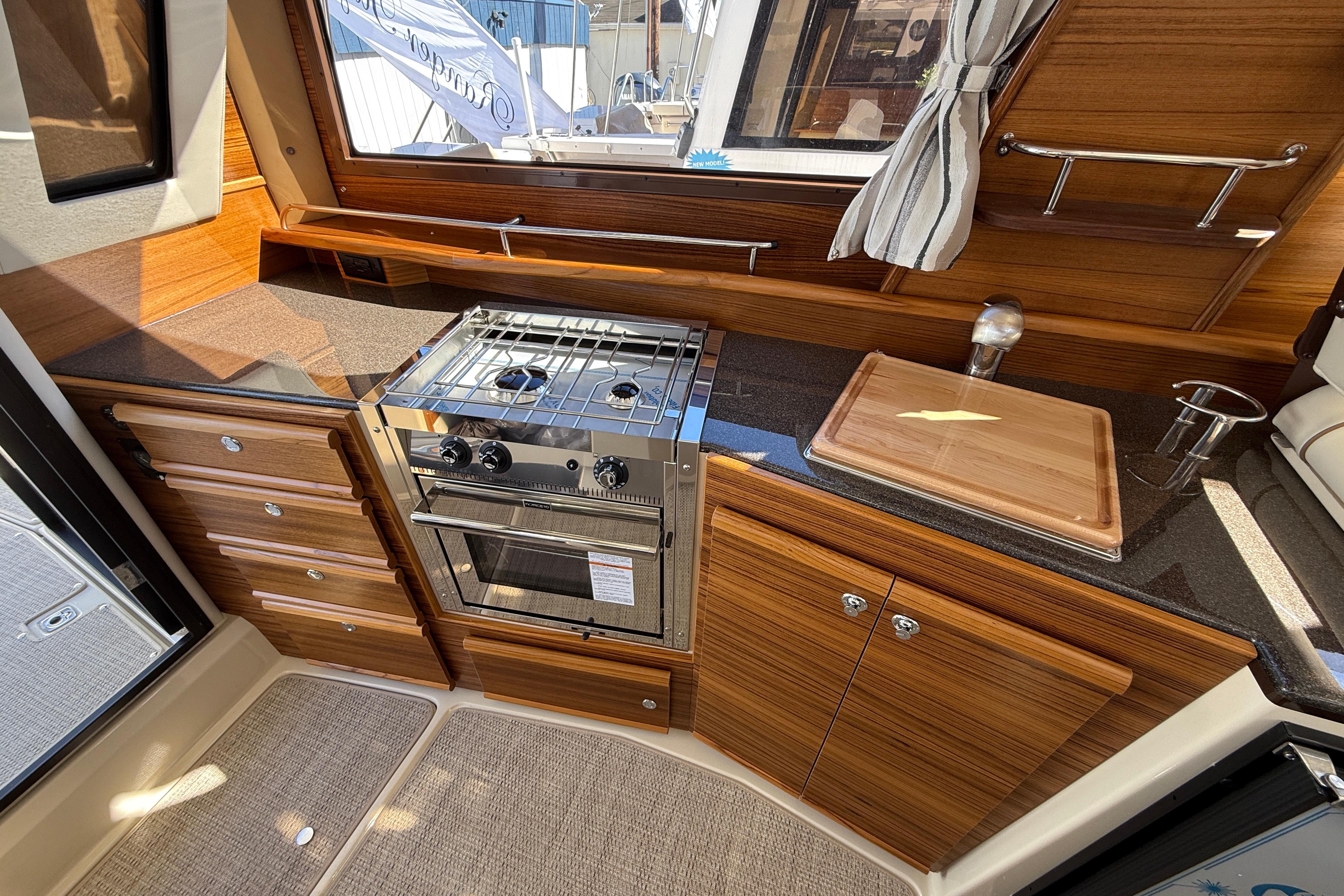 Inside, the R-29CB is surprisingly spacious for its size. You get a full galley, a bright salon with excellent visibility, a private forward stateroom, a mid-berth, and an enclosed head with shower. The single-level salon and large windows give the boat an open, welcoming feel.