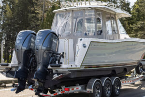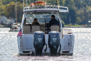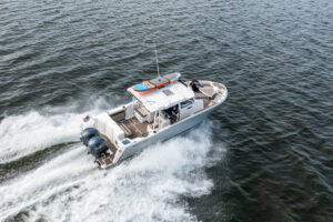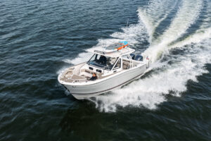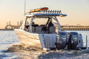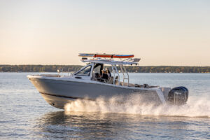 When built by fishboat companies like Grady-White, Cobia, and Pursuit, we tend to call them “dual-consoles.” Either way, the basic layout serves especially well for family activities on the water. The boats, however, have gotten considerably larger and much more powerful, as families shift their water time from cabin cruisers to dayboats. Today’s bowriders/dual consoles take advantage of computer-aided design and weight analysis to produce hull forms that balance well even with half a dozen people in the bow cockpit and have enough flare molded in to keep them dry underway. The boats also now sport leisure features that would have put the most luxurious cabin cruisers of the 1960s to shame.