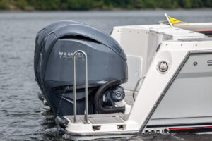 Meanwhile, Fluid Motion’s proprietary, circular Laminar Flow Interrupters in the bow keep the hull locked in during hard turns, functioning in the hull/water interface the way dimples do on a golf ball in flight. We were suitably impressed by how well they kept the hull planted in maneuvers at higher speeds. With this setup and the strong, smooth Yamahas doing what they do, the S-310 CW (which weighs in at more than 10, 500 pounds) topped out at 41 knots (5400 rpm), with its painted bottom and auto-leveling trim tab system limiting the revs.