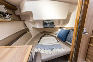 To port are twin companion seats, with a refrigerator/ freezer beneath. The companionway lies in between the helm and companion seats. It leads to a small but functional, lockable cabin inside the console, in the deepest part of the hull. The cabin has air conditioning and reverse-cycle heat. The electrical system includes both 110- and 12-volt circuits, using shore power or a combination of a 3000w inverter and lithium-ironphosphate batteries. We measured headroom at 6’2″, with 6’1″ inside the enclosed head/shower to starboard. A V-berth forward measures 82″ foreand-aft, 92″ along the sides.