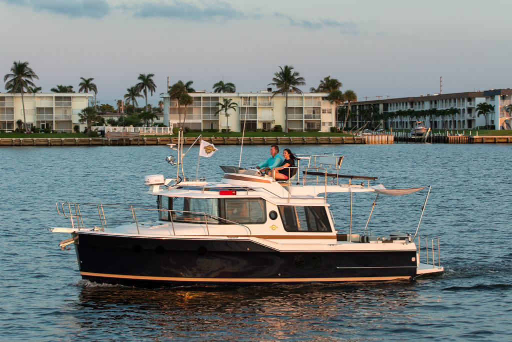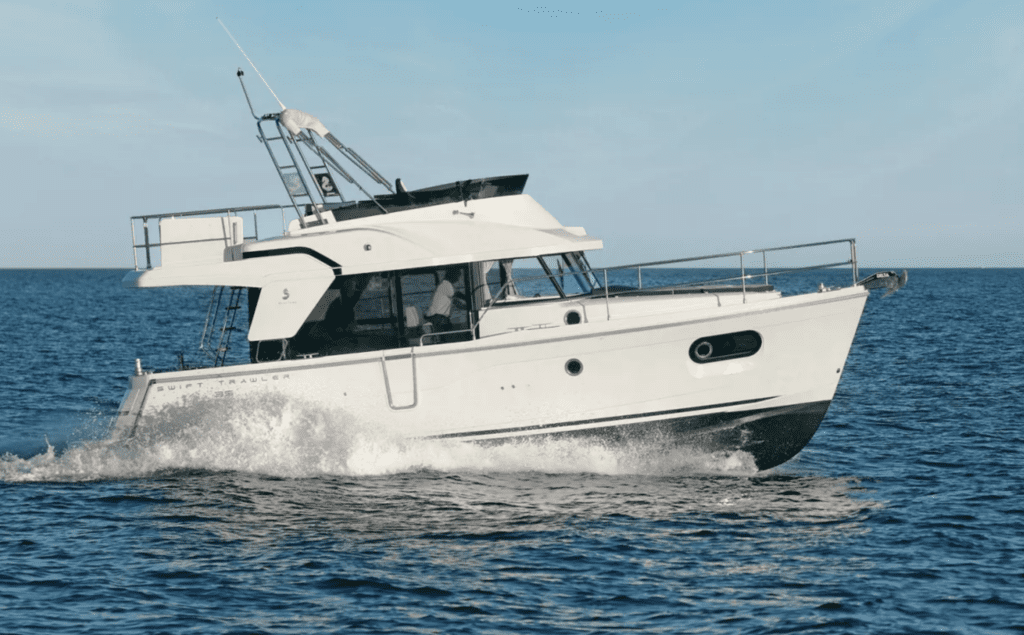 3. Beneteau Swift Trawler 35: LOA: 37 feet; Beam: 13′ 3″. Renowned for its stability and quick cruising capability, it provides a cozy layout and efficient performance.