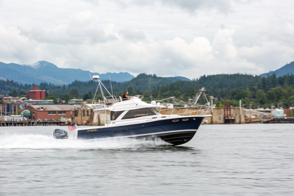 4. Cutwater C-32 CB: LOA: 37′ 8″; Beam: 10 feet. Known for its space-maximizing design and efficiency, making it a comfortable choice for long journeys.