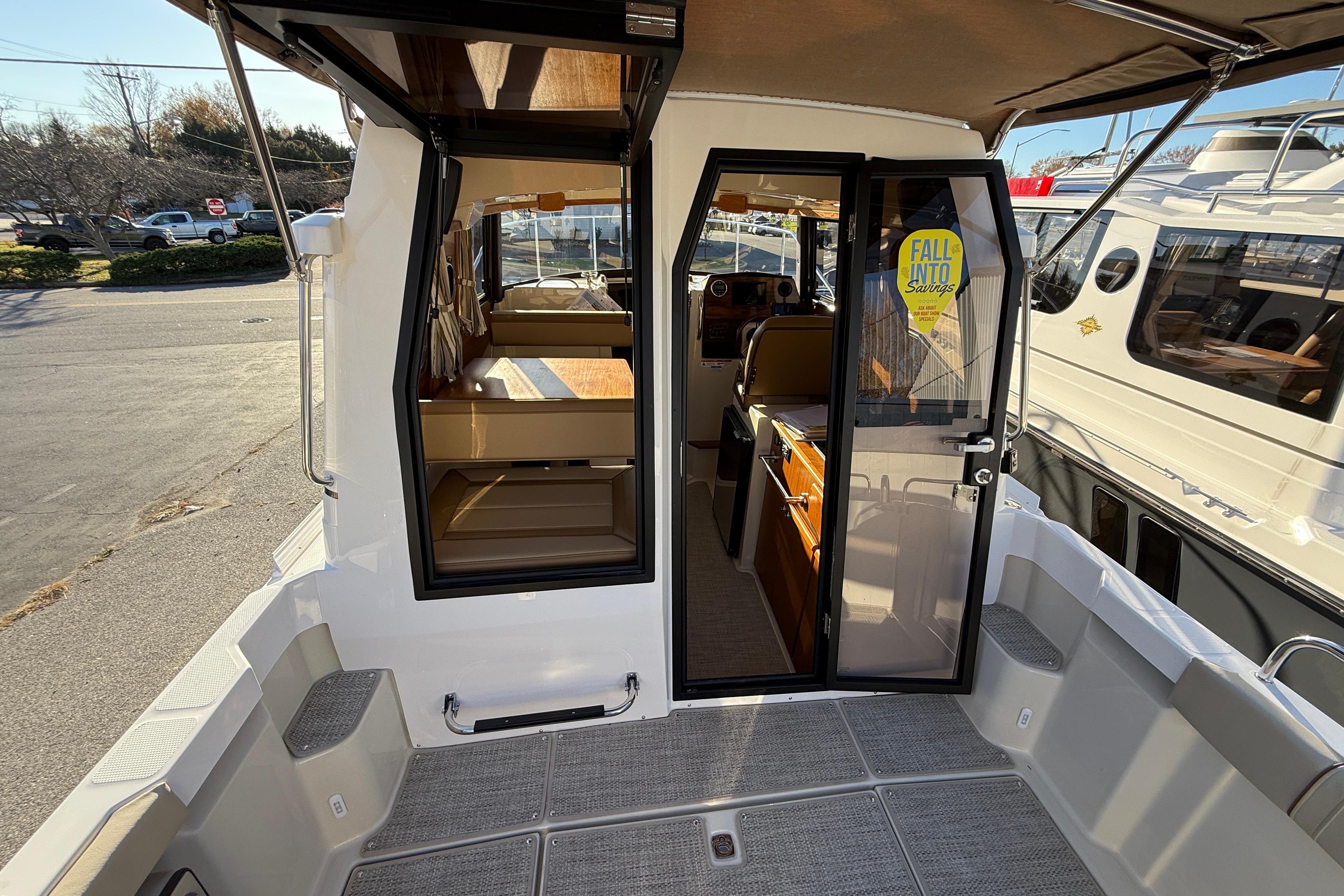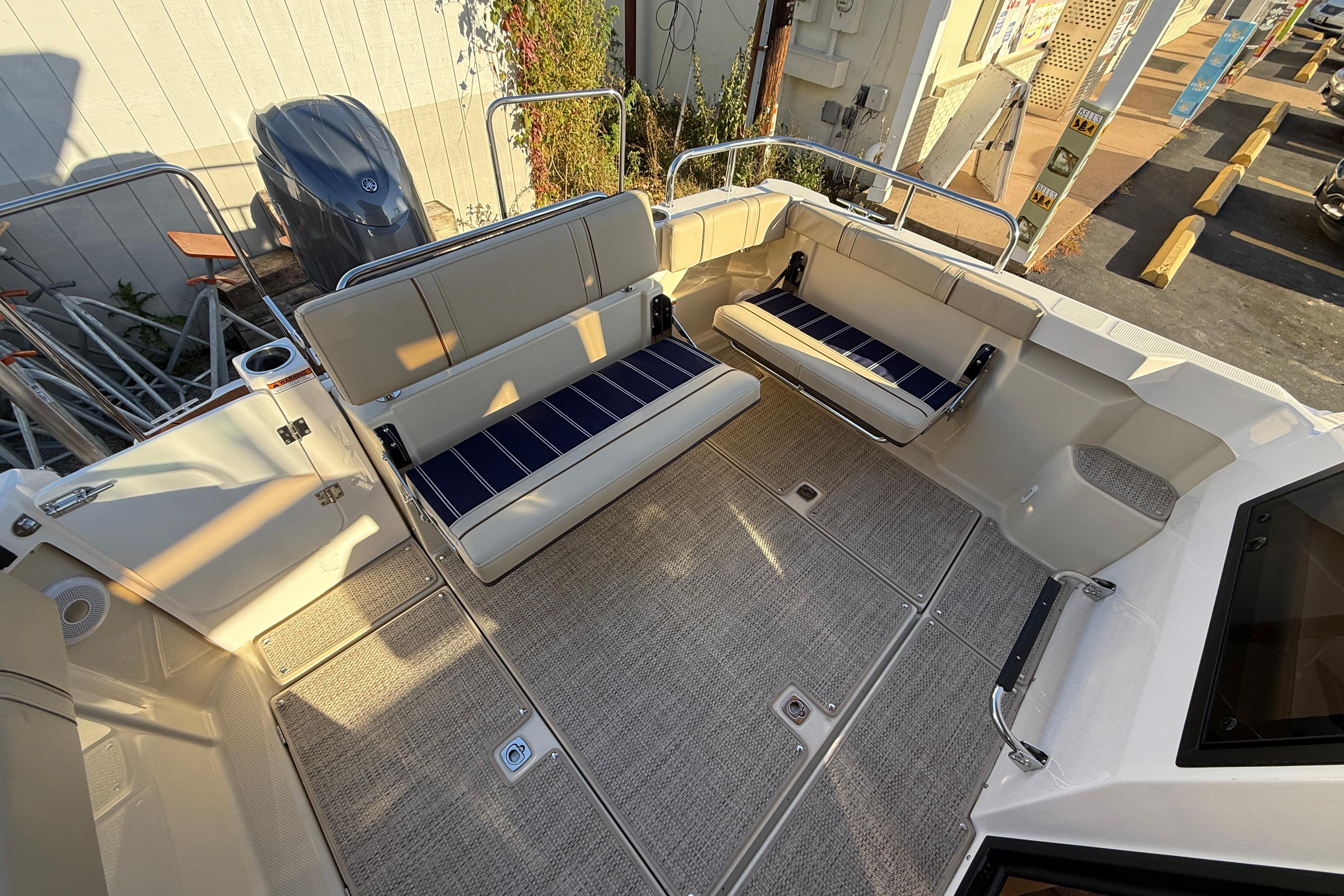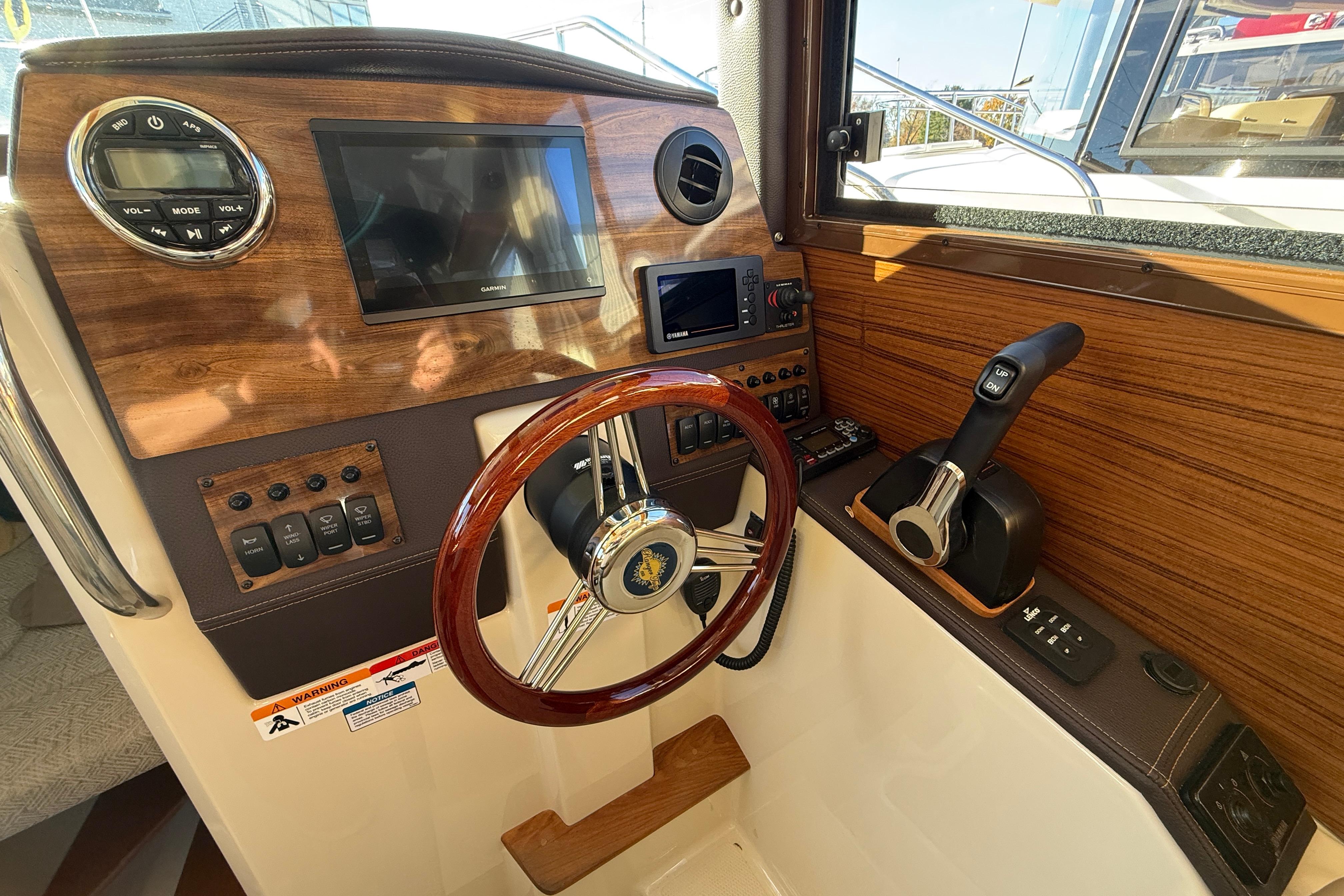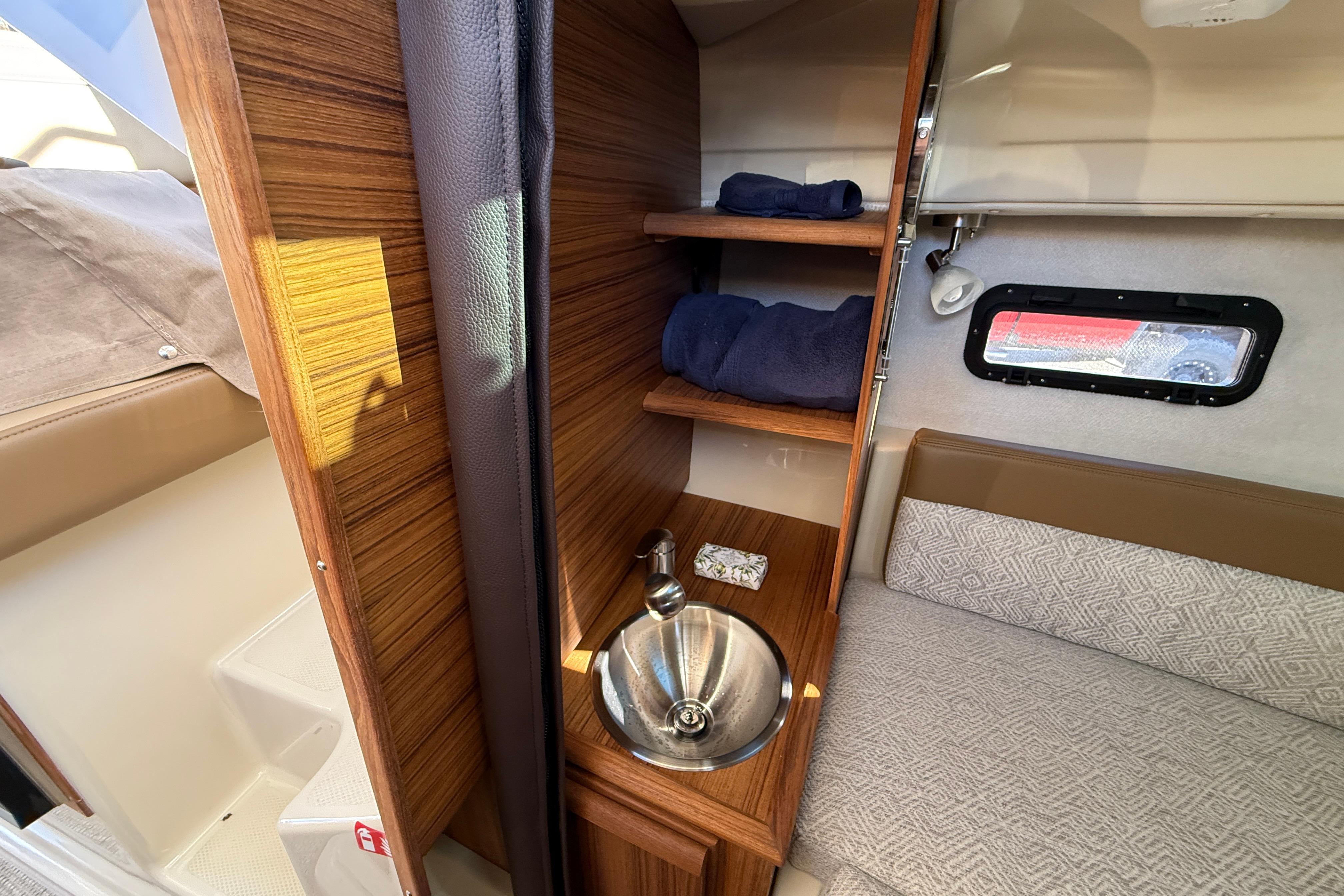 Thoughtful cockpit and helm features elevate it beyond expectations. A 9” Garmin chartplotter with GPS and sonar, full engine instrumentation, USB ports, dual drink holders, wipers, and a bolstered helm seat await behind the wheel. The cockpit also includes rod holders, a folding double seat, sport racks, swim step, stainless ladder, soft-top cover, and an opening glass bulkhead to connect the cockpit and cabin seamlessly.