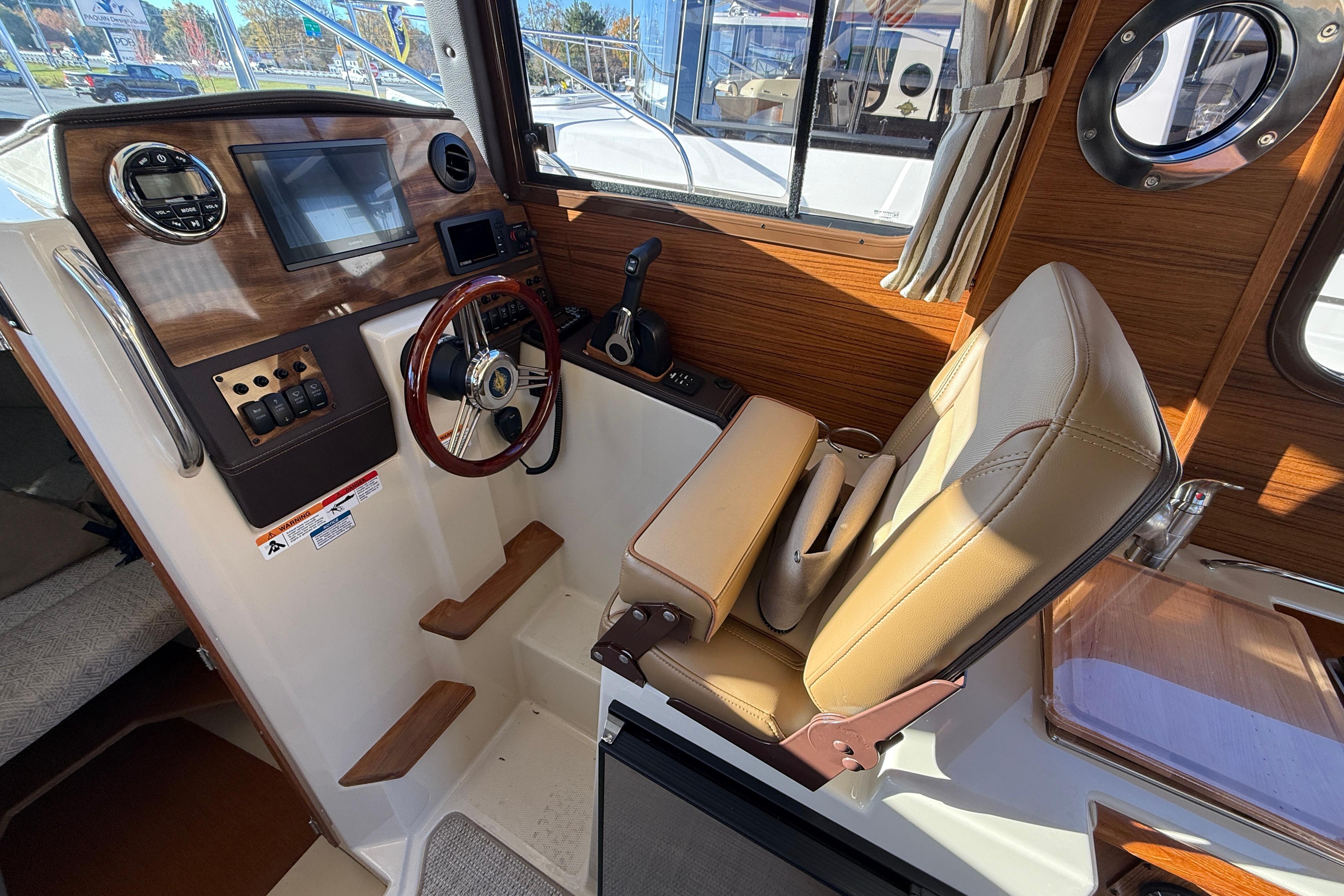 The 2026 Ranger Tugs R-23 surprises with its blend of classic tug-inspired lines and modern functionality. A striking curved windshield and visor, combined with four overhead skylights, sliding side windows, and an opening glass bulkhead, provide panoramic views and abundant natural light throughout the cabin. The walk-in helm benefits from generous airflow and open-air ambiance thanks to the skylights and portlights—ideal for cruising in all seasons.