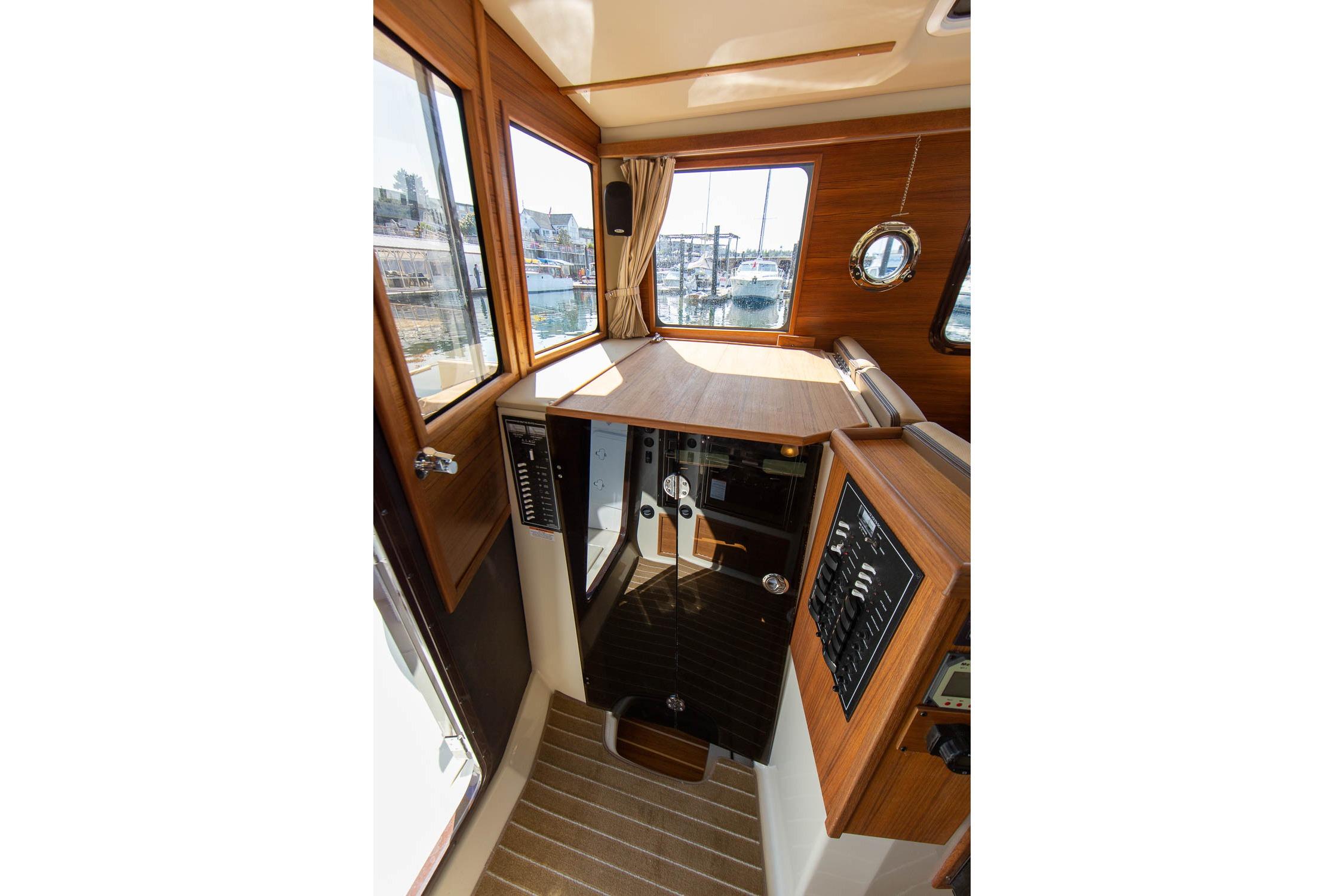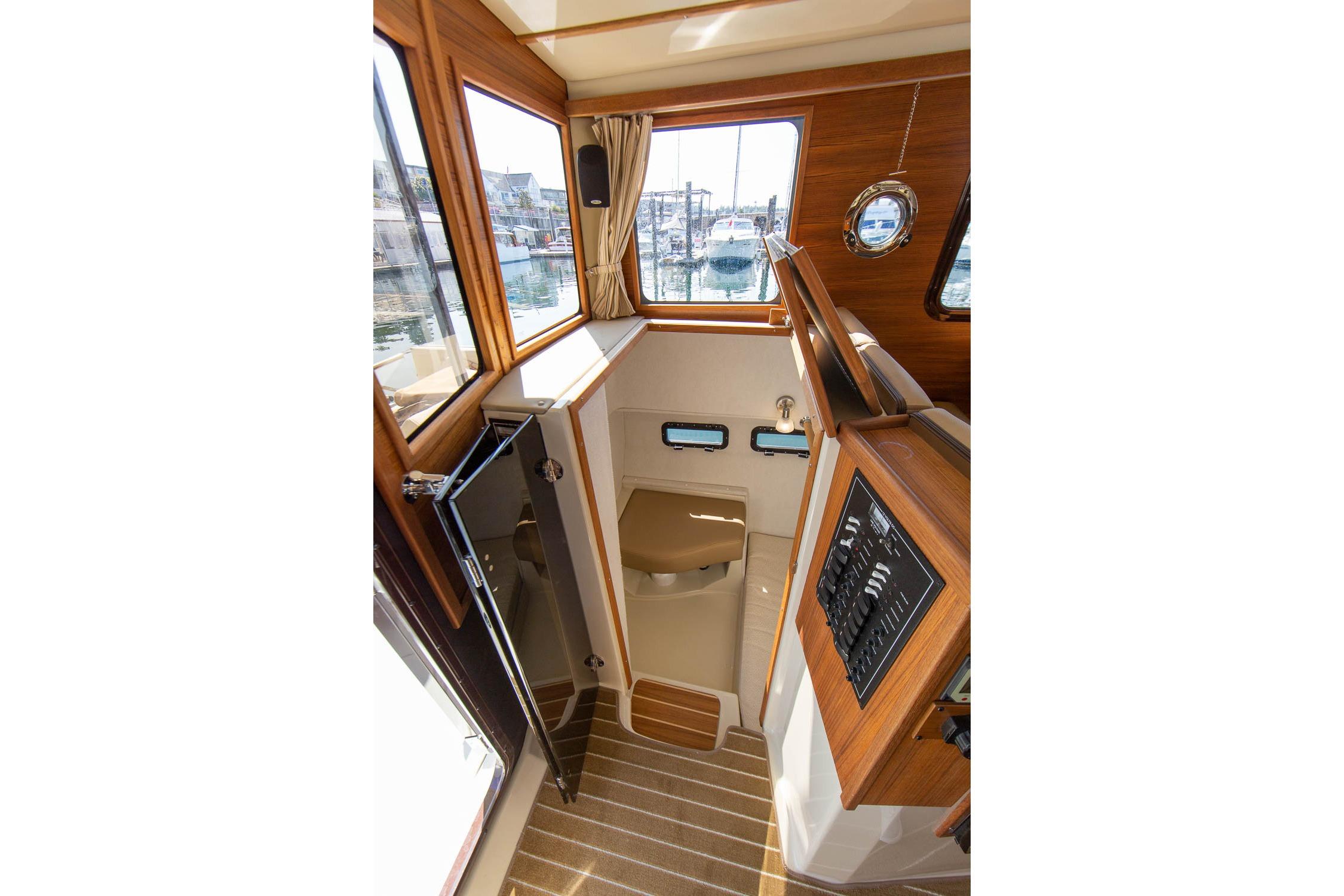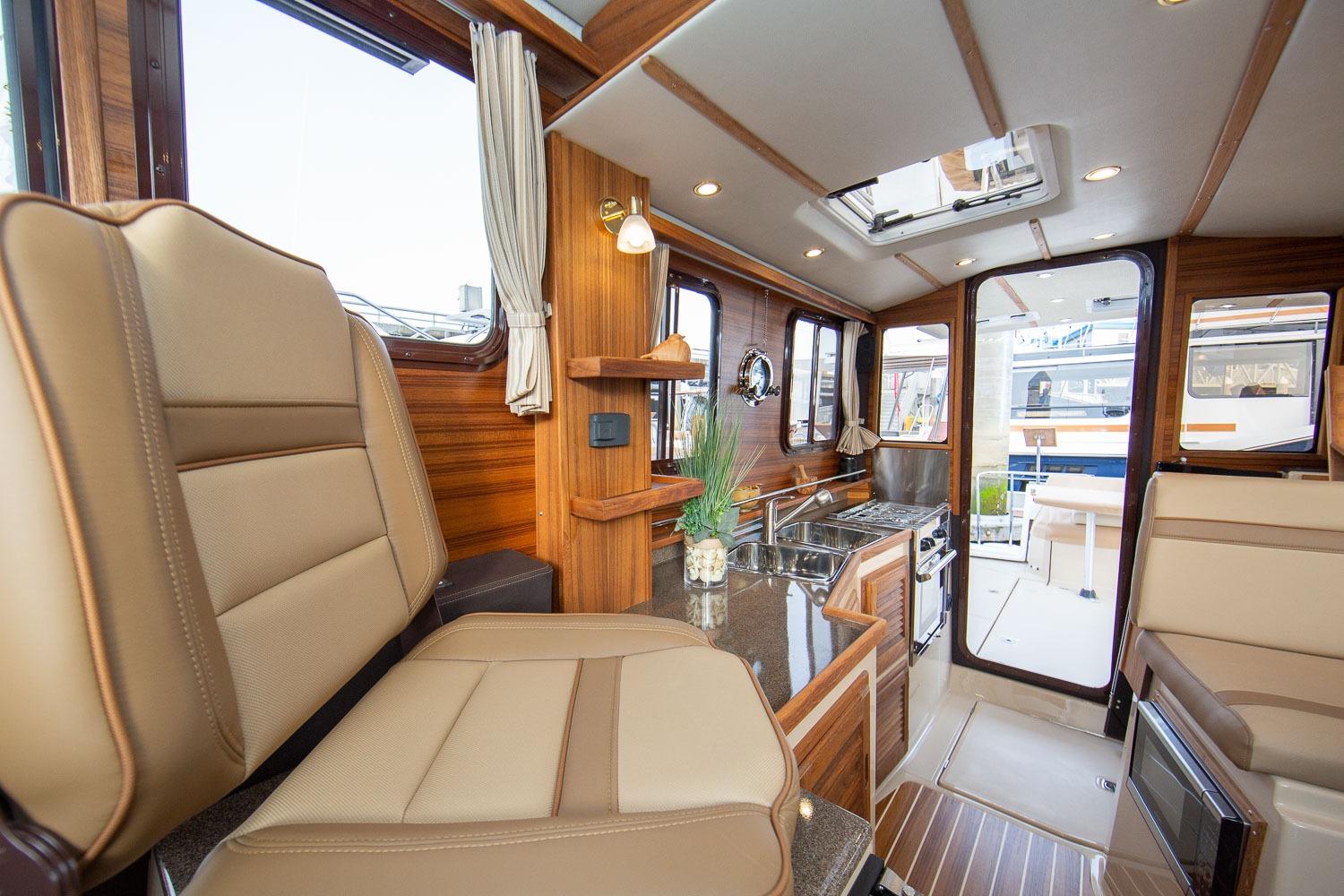 Inside, the R-31S is bright and well laid out. You’ll find a full galley, a large dinette that converts for extra sleeping, a private forward stateroom, a mid-berth, and an enclosed head with shower. The salon windows bring in a lot of natural light and give you great visibility at the helm.