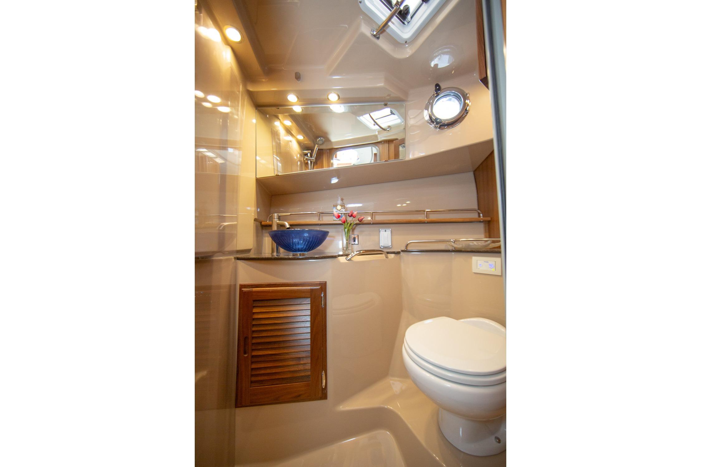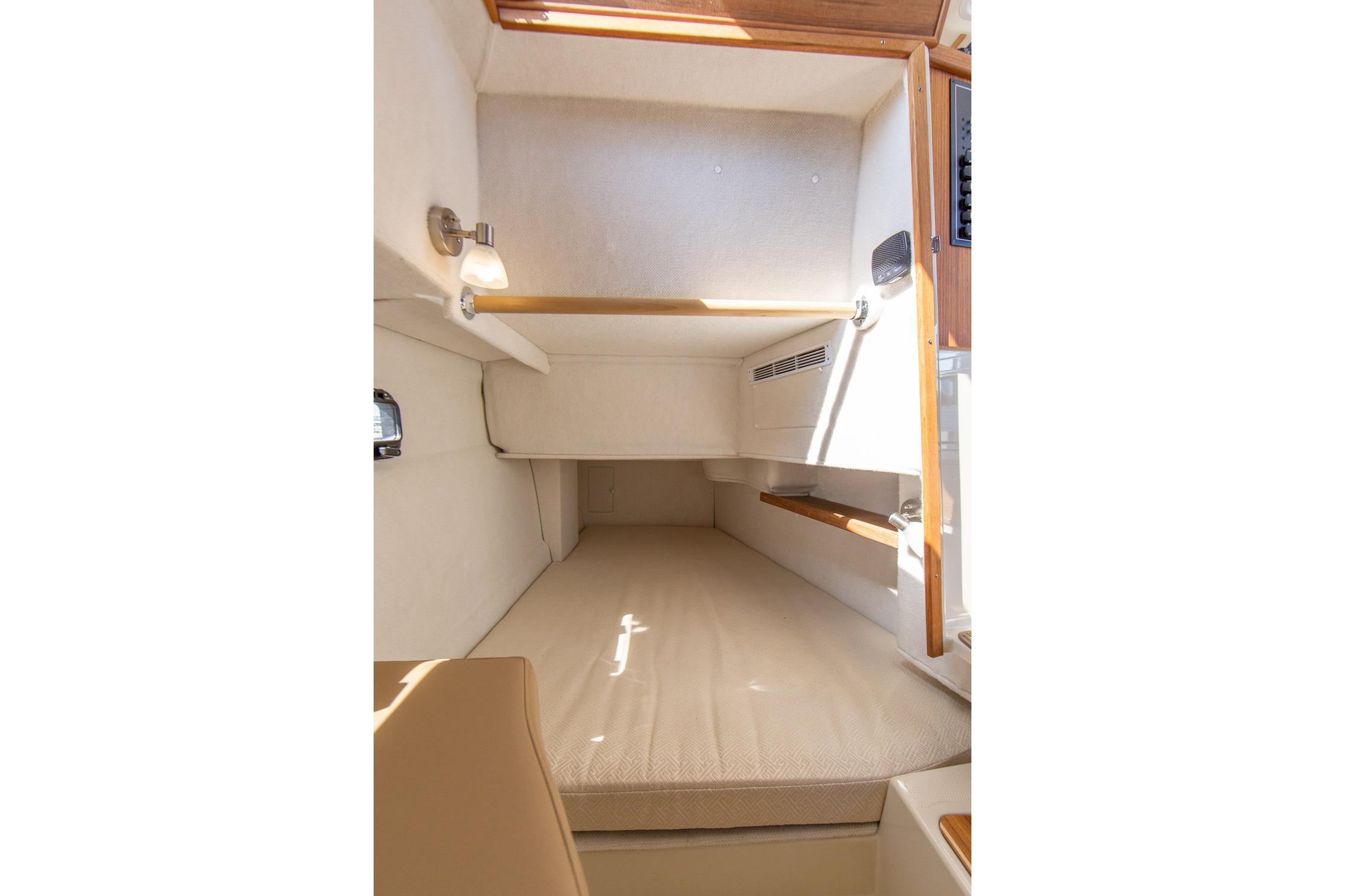 The cockpit is flexible and well-designed, featuring fold-out seating, storage, access to the swim platform, and plenty of room to relax or fish. It’s a versatile layout that works well whether you’re cruising with family or hosting friends at anchor.