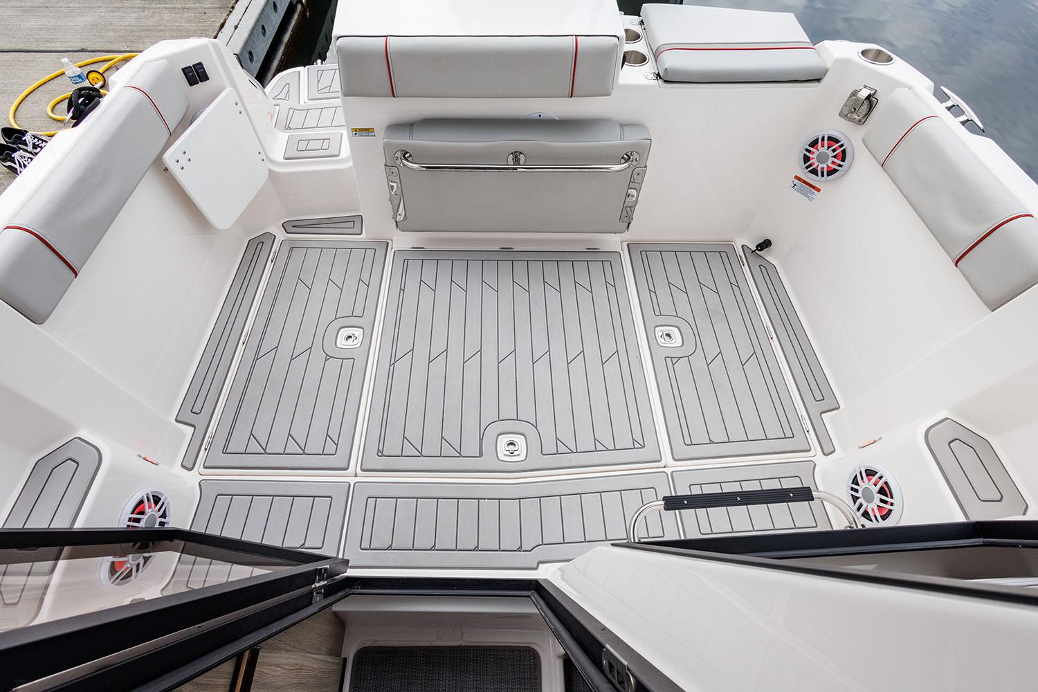 Powered by a Yamaha 300 HP outboard, the S-250 C is fast and efficient. The double stepped hull increases efficiency and performance, reduces fuel consumption, and contributes to her quick time to plane. The S-250 C hull also incorporates our Laminar Flow Interrupter technology for smooth, positive cornering. The captain will love the 360-degree view from the helm seat.
