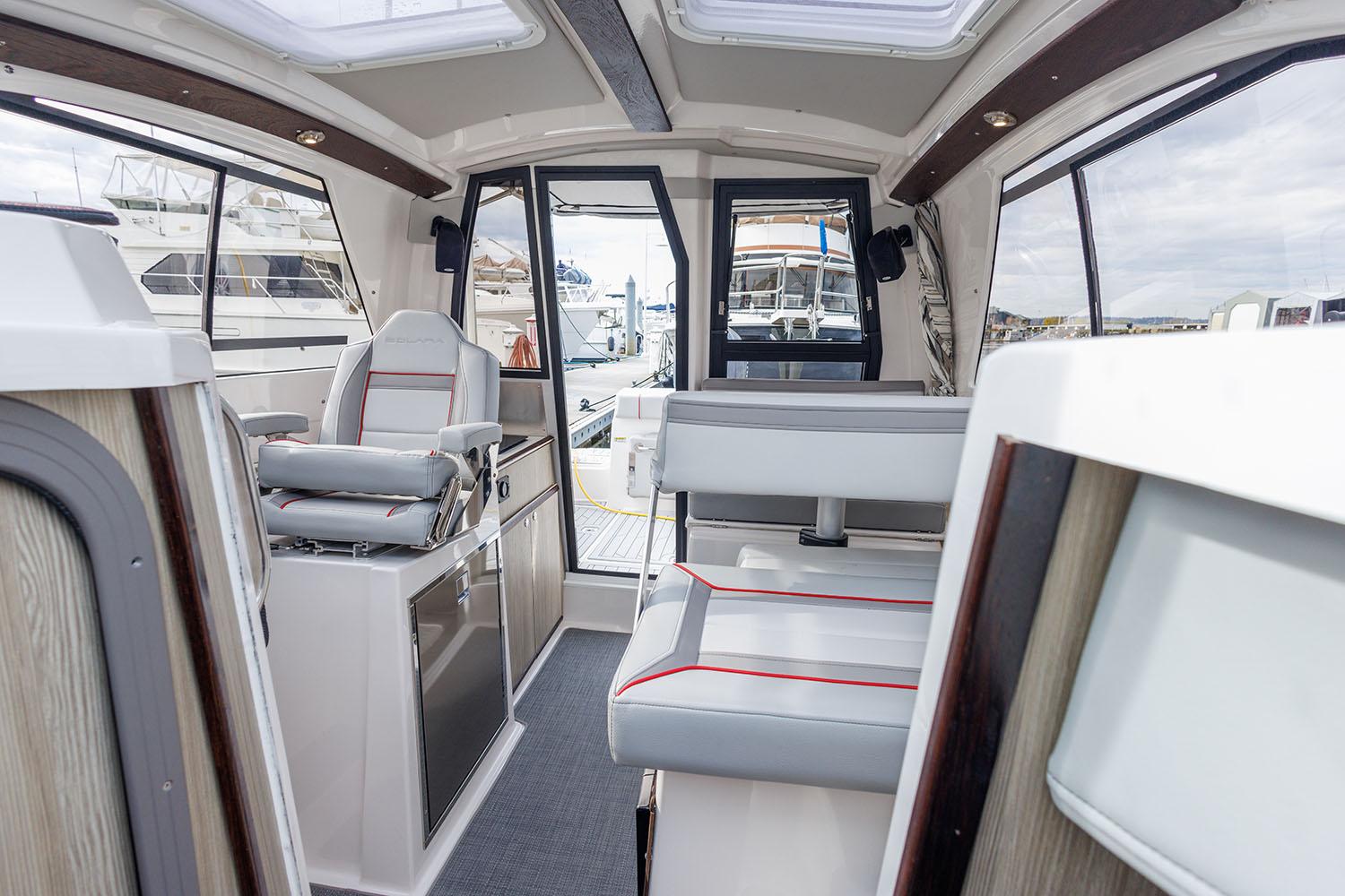 The main salon features a dinette that transforms into an additional berth as well as a mid-berth under the dinette that is great for kids, or it can be used for additional storage. Open the bifold rear glass window to the cockpit to expand your entertaining space and let the outside in.