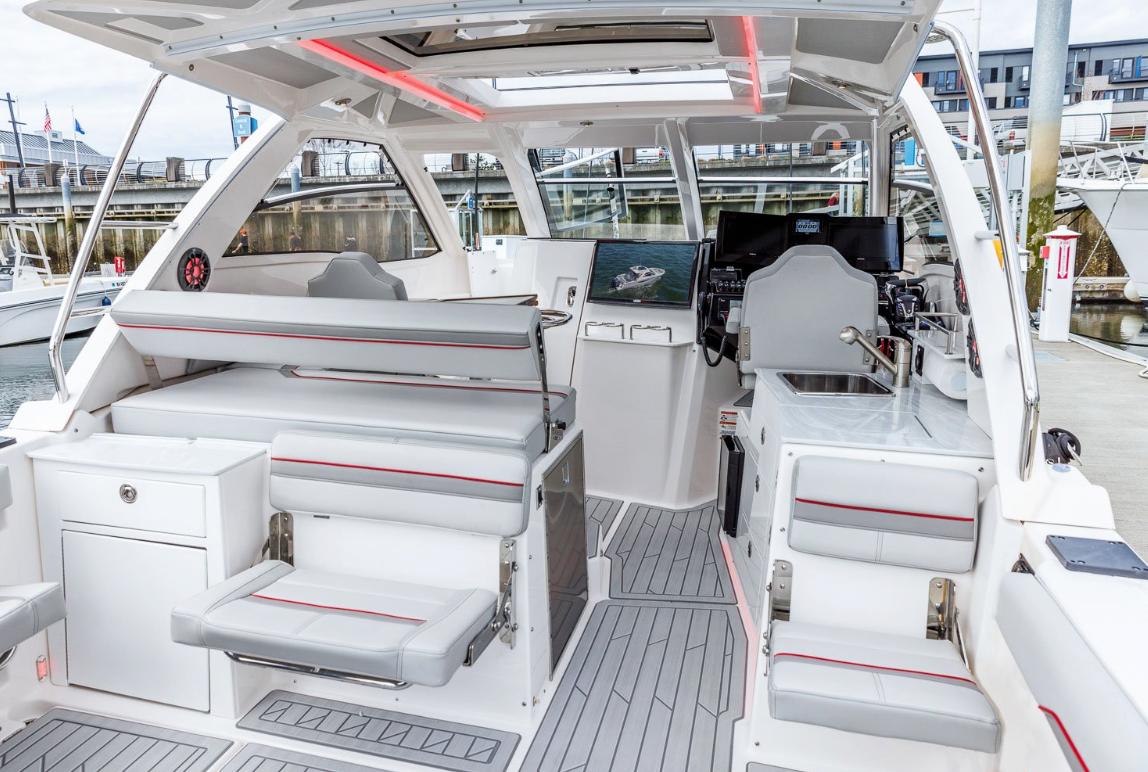 The Helm of the S-310 SC is a true command center featuring twin chartplotters, autopilot panel, and accessory switches, all within easy reach. Inlaid, red-woven carbon fiber adds a premium touch to the switch panel. A portside walkthrough allows convenient access to the spacious bow lounge. Standard bow and stern sunshades keep guests shaded on the hottest of days. Belowdecks, a climate-controlled forward stateroom and head with shower are perfect for overnighting and long stays alike.