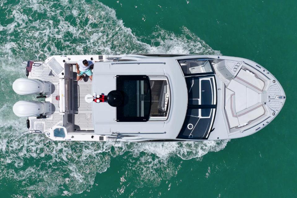 To say the S-310 SC is a master of entertainment is an understatement. Three distinct on deck social spaces and sleeping accommodations below make this sport coupe beyond ready for all-day fun. The large cockpit features seating for 6, including our fold out seats and two versatile lounges. The convertible sunset lounge can face both forward and aft, and the transforming dinette backrest flips to become a spacious lounge. In the open and airy cabin of the S-310 SC lies a full galley with ample storage, an L-shaped dinette, LED edge lighting, lighted speakers, and a wide opening sunroof.